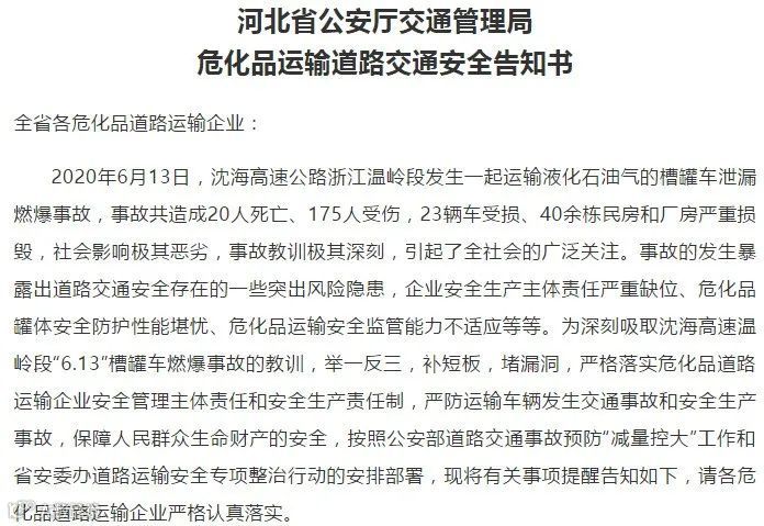 河北省公安厅交管局向全省危化品运输企业发出《道路交通安全告知书》,督促督导危化品运输企业切实履行交通安全管理的主体责任,主动清理车辆存在的逾期未检验、未报废、违法未处理、非法改装等道路交通安全隐患,主动清零驾驶人满分未学习、逾期未审验、逾期未换证等交通违法,教育管理驾驶人严格按照公安机关批准的路线、时间行驶;严格规范装载货物,不得混装、超载;在高速公路上行驶时速度不超过80km/h,在其他道路上行驶速度不得超过60km/h等。