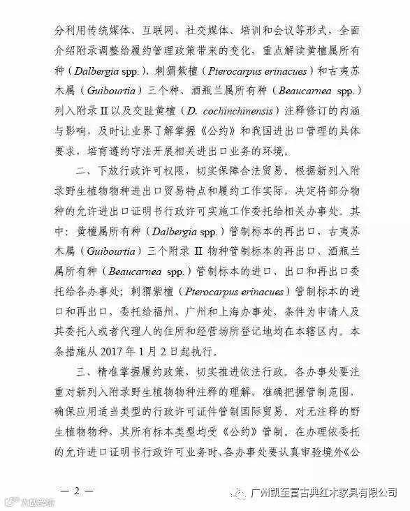 二、下放行政许可权限,切实保障合法贸易。根据新列入附录野生植物物种进出口贸易特点和履约工作实际,决定将部分物种的允许进出口证明书行政许可实施工作委托给相关办事处。其中:黄檀属所有种(Dalbergia spp.)管制标本的再出口,古夷苏木属(Guibourtia)三个附录II物种管制标本的再出口,酒瓶兰属所有种(Beaucarnea spp.)管制标本的进口、出口和再出口委托给各办事处;刺猬紫檀(Pterocarpus erinacues)管制标本的进口和再出口,委托给福州、广州和上海办事处,条件为申请人及其委托人或者代理人的住所和经营场所登记地均在本辖区内。本条措施从2017年1月2日起执行。