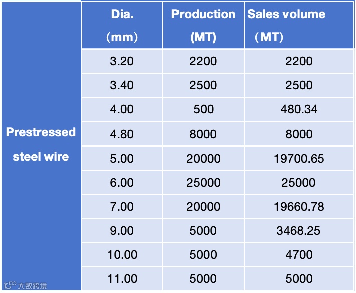 Our PC strand and PC wire production and sales have grown steadily in the past year, the specific production volumes by sizes are as follows.