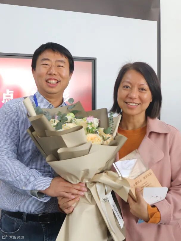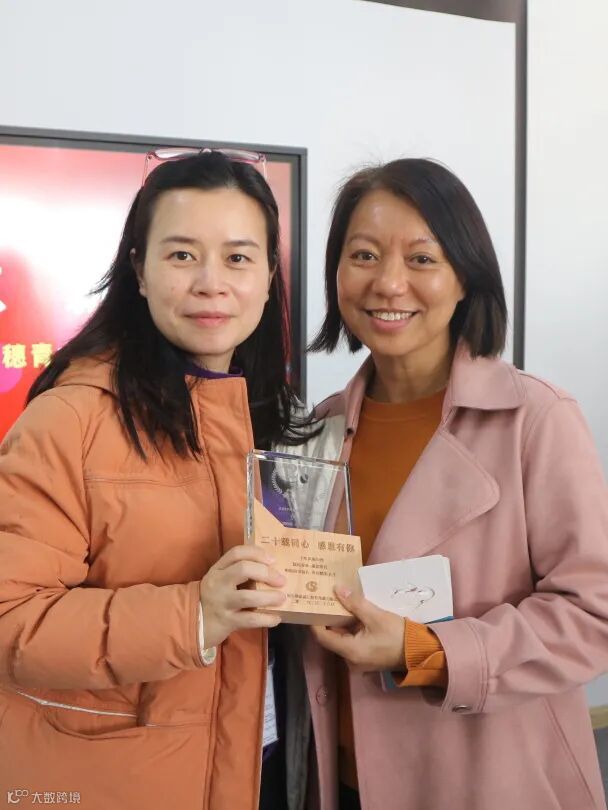 总经理为青姐送上光荣退休纪念奖牌,感谢青姐二十载为公司的付出。