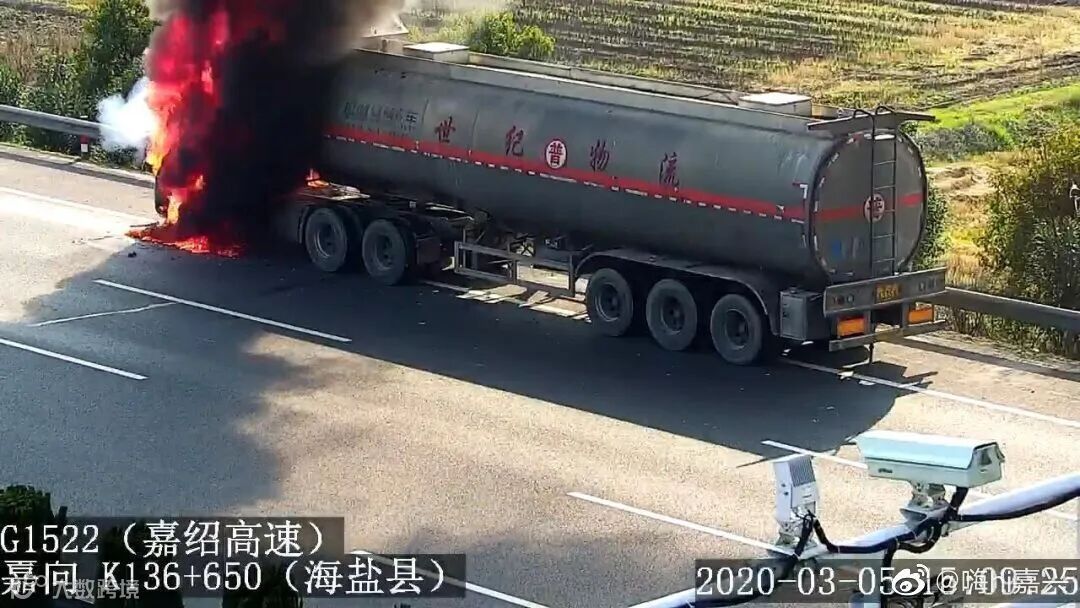 近日,G1522常台高速(嘉绍)海盐段,一辆槽罐车突然起火,监控里槽罐车车头已经被大火吞没,连罐体和油箱都被烧破,现场浓烟滚滚。驾驶员李师傅说,车上装了33吨乙二醇,在七、八辆消防车的奋力扑救下,大火才被浇灭。民警根据李师傅的描述判断可能是副驾驶室下面的线路老化造成的,但具体起火原因还需专业机构进行鉴定。嘉兴高速交警支队
