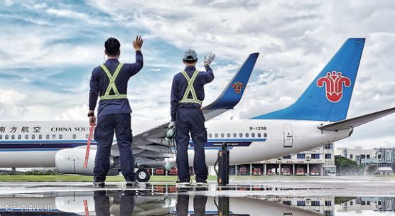 珠海机场特大暴雨后机务人员目送客机起飞。