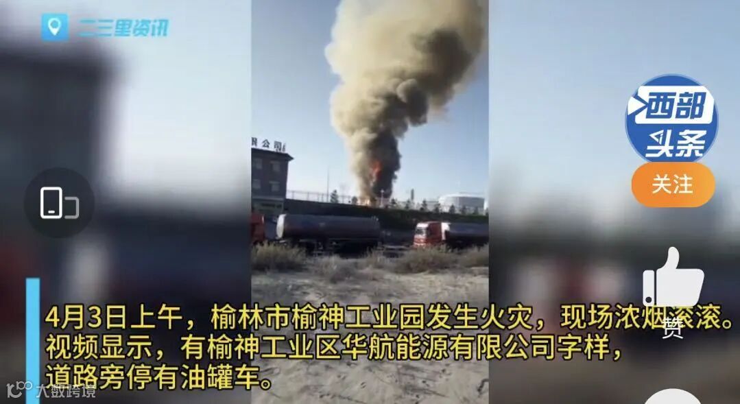 4月3日上午,榆林市榆神工业园发生火灾,现场浓烟滚滚。现场视频显示,有榆神工业区华航能源有限公司字样,道路旁停有油罐车。下午,榆林市榆神工业区华航能源有限公司办公室一名女工作人员表示,事发时她们撤离,目前火已被扑灭,具体情况她不是很清楚。榆神工业园区管委会综合办主任李有平表示,他们去了现场,清水工业园一厂区内突发火灾,目前火势已扑灭,事故原因还在调查中。