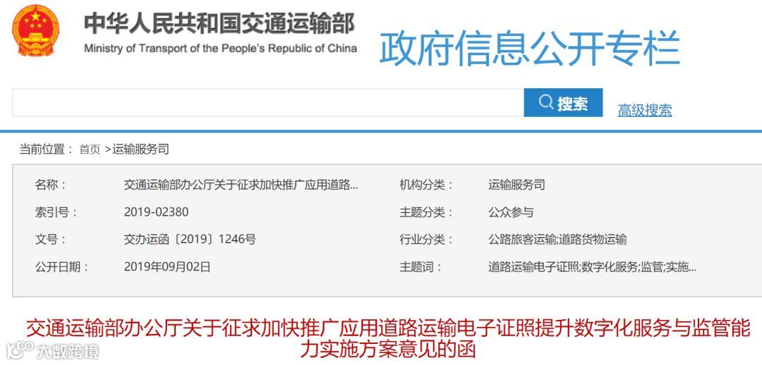 为深入贯彻落实国务院关于加快推进“互联网+政务服务”的决策部署,加快推广应用道路运输电子证照,更好满足广大道路运输经营者和从业人员网上办事需求,切实提升道路运输便民服务水平,我部组织起草了《关于加快推广应用道路运输电子证照提升数字化服务与监管能力的实施方案(征求意见稿)》。现送你单位征求意见,并同步向社会公开征求意见。请于2019年9月16日前将书面意见反馈我部。