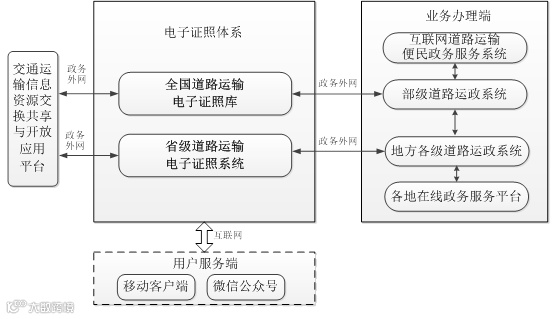 (二)总体架构。按照两级架构模式,建设全国电子证照库和各省级电子证照系统。明确了全国电子证照库和各省级电子证照系统之间,以及与业务办理端(包括运政系统、网上便民运政系统、各地在线政务服务平台等)、用户服务端(部移动客户端和微信公众号、12328电话系统移动客户端和微信公众号)之间的业务流和信息流。