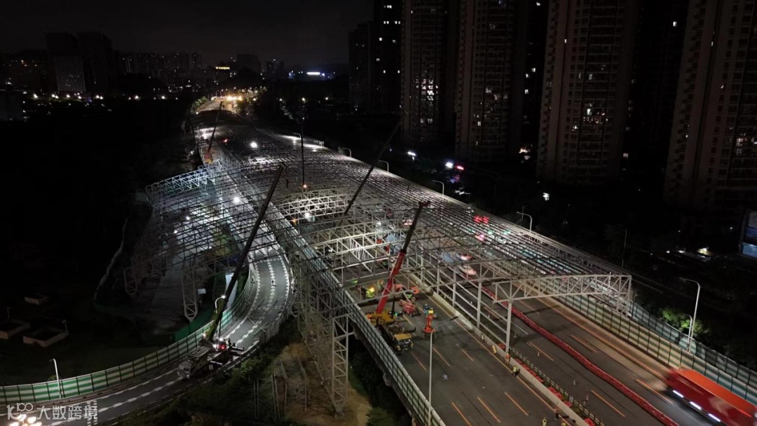 声屏障工程位于黄埔区保利罗兰小区段,设计长度480米,上部结构共64轴,最大跨径约89米,是国内跨径最大全封闭声屏障工程。该项目的吊装共涉及3000多吨的钢构材料、3万多平方米的屏体,屏体异型构件占比30%,需多次编程定模加工;钢结构细部构件繁多,每轴施工需螺栓连接约140处,且每轴每榀构件尺寸均不相同,螺栓孔安装需要精确对位,吊装精度高、安装耗时,为不影响日间正常通行,需控制在深夜至次日凌晨不足6个小时的紧迫时间中进行,复杂性前所未有,对吊装技术、施工组织及相关安全措施提出了严格要求。