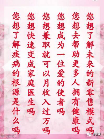 在21世纪的今天,健康已成为人们追求的目标。亿生康公司从创立之初,就一直秉承“让亿万人一生健康”的愿景,传播爱与健康。在“心”的感召下,公司出品了一套可以惠及亿万老百姓的好产品——媛泊馨寒湿膏,并励志打造10万家庭医生。让产品替代无数双手帮助更多人获得健康,小病小痛不用看医,为国家减少医疗费用,为家人的健康保驾护航。为了更好地将产品带给更多有需要的人,公司重金请IT精英团队为我们量身定制了一套方便快捷的系统,能使产品更快速地推广。这套体系和马云倡导的“新零售”不谋而合,结合微商、电商、店商、直销的各项优势,打造一个全新线上线下为一体的商业模式,分享经济 、大众创业、全民健康!
