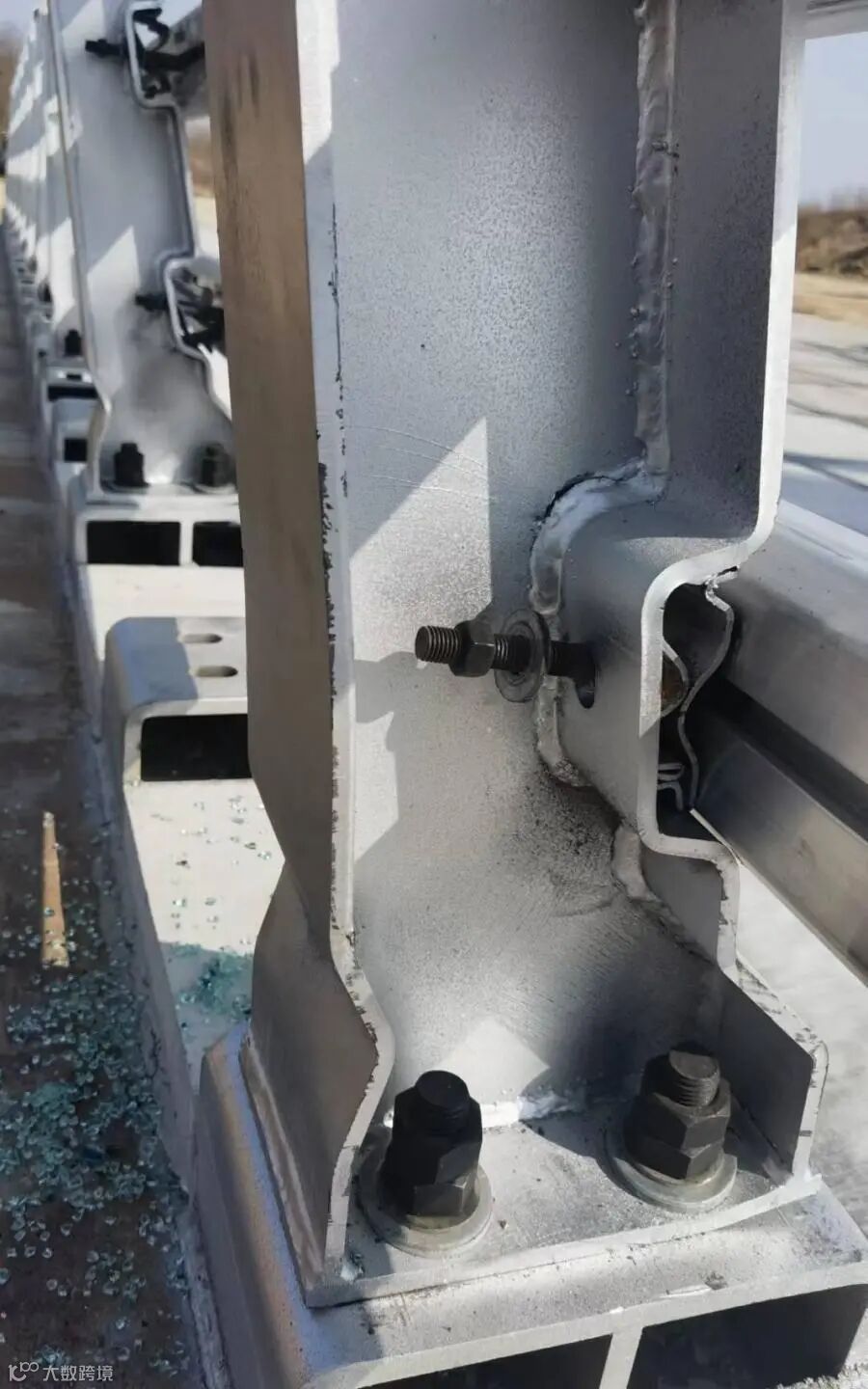 麒麟款防撞护栏由江苏卡斯特桥梁构件有限公司自主研发,摒弃“硬碰硬”的传统设计理念,通过对护栏缓冲块、卸能脚、底板、支撑件等关键结构与力学性能的研究,成功通过实车足尺碰撞试验检测,完全符合《公路护栏安全性能评价标准》(JTG B05-01),同时满足防护等级要求。