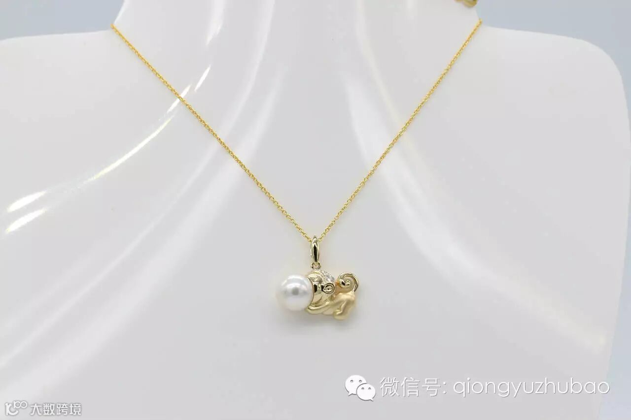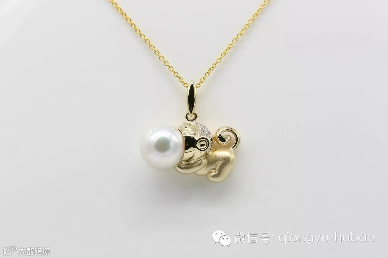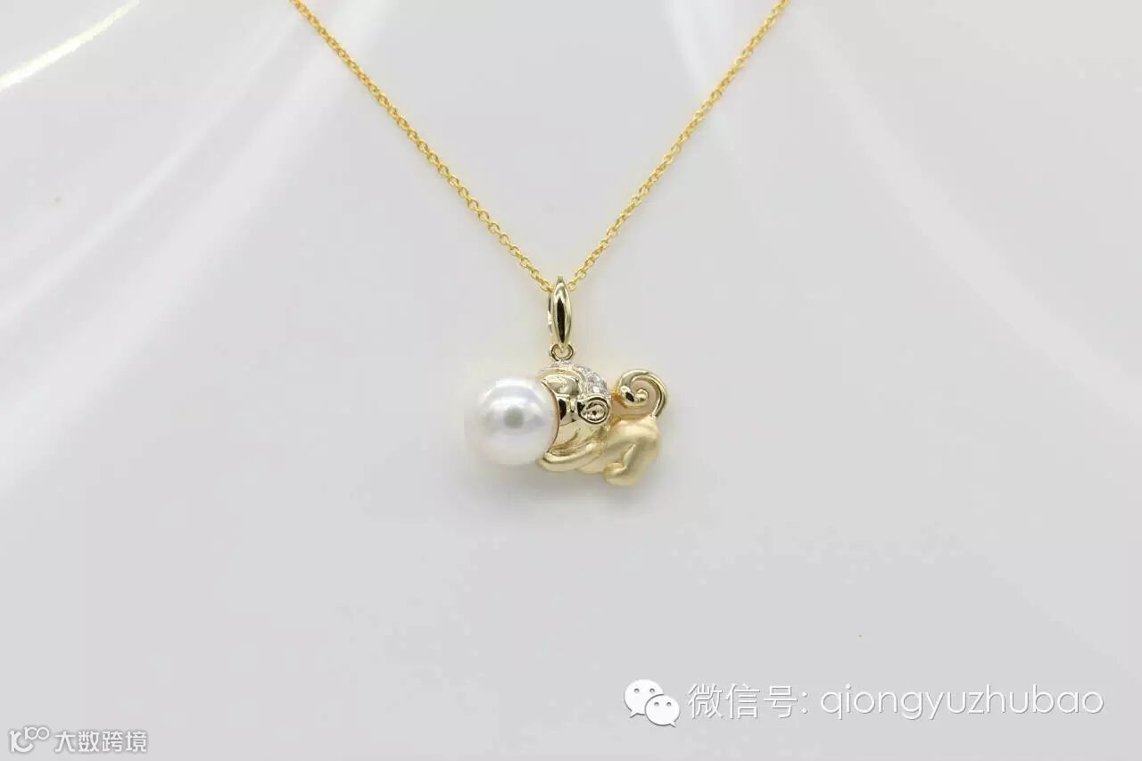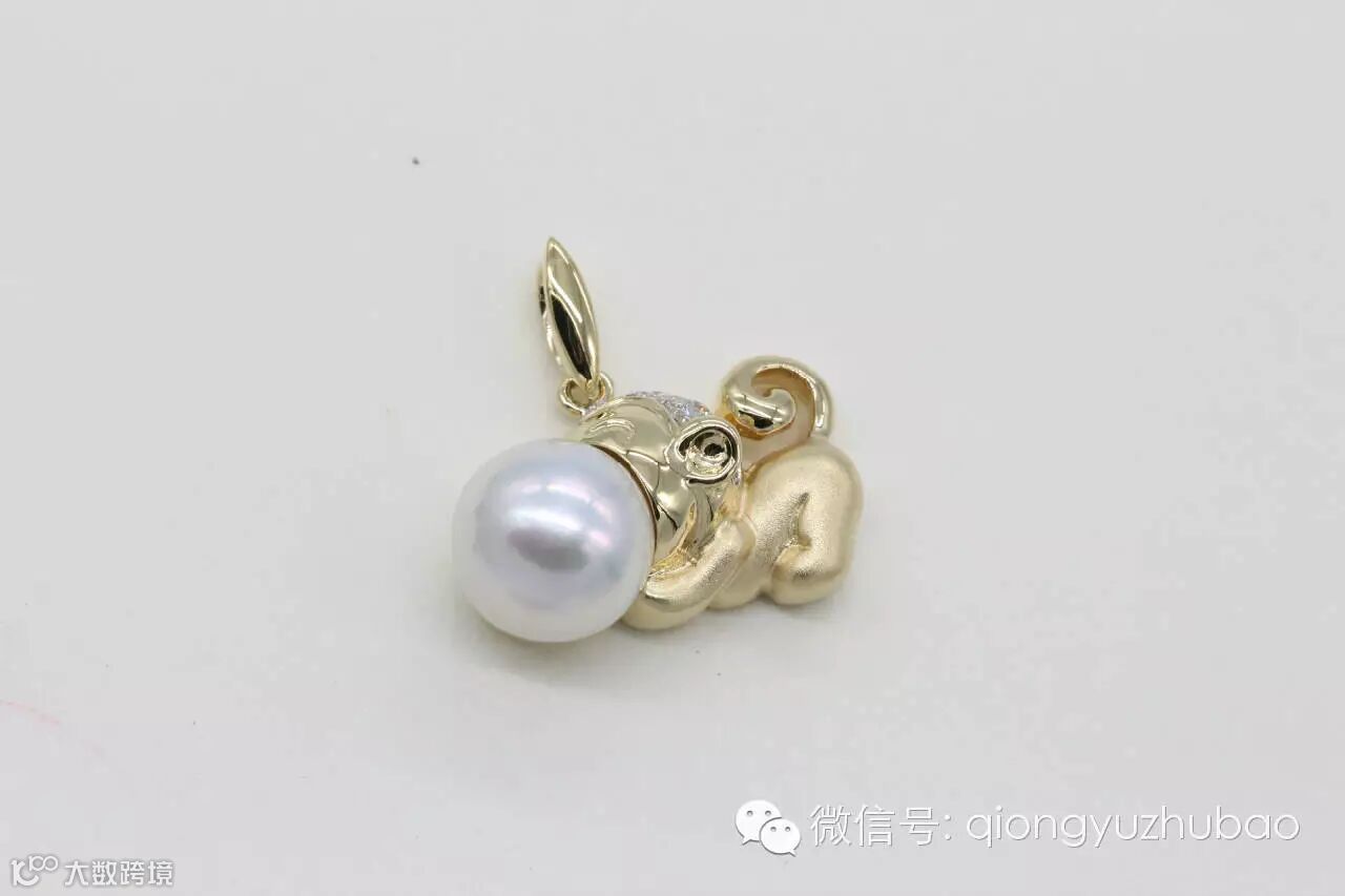 第一次看到设计图,我就认定了它,它就是我梦寐以求的造型,非常的个性化,与以往传统的生肖贺岁饰品不同。18K黄金上做了局部磨砂处理,镶嵌碎钻点缀,精挑细选的海水珍珠,经过巧妙的设计,一只活泼灵巧的金猴诞生了,惟妙惟肖,非常惹人喜爱。