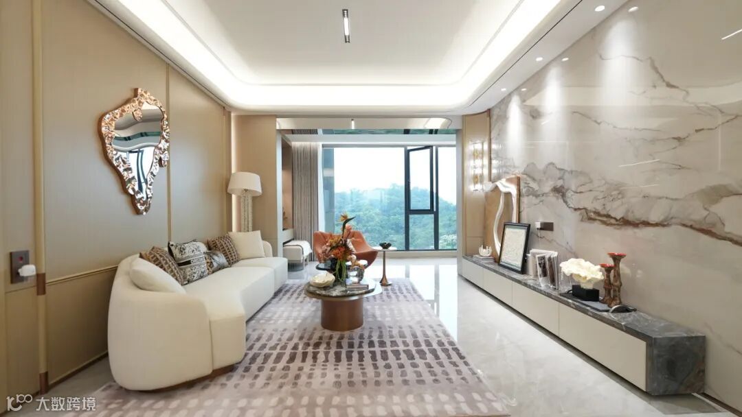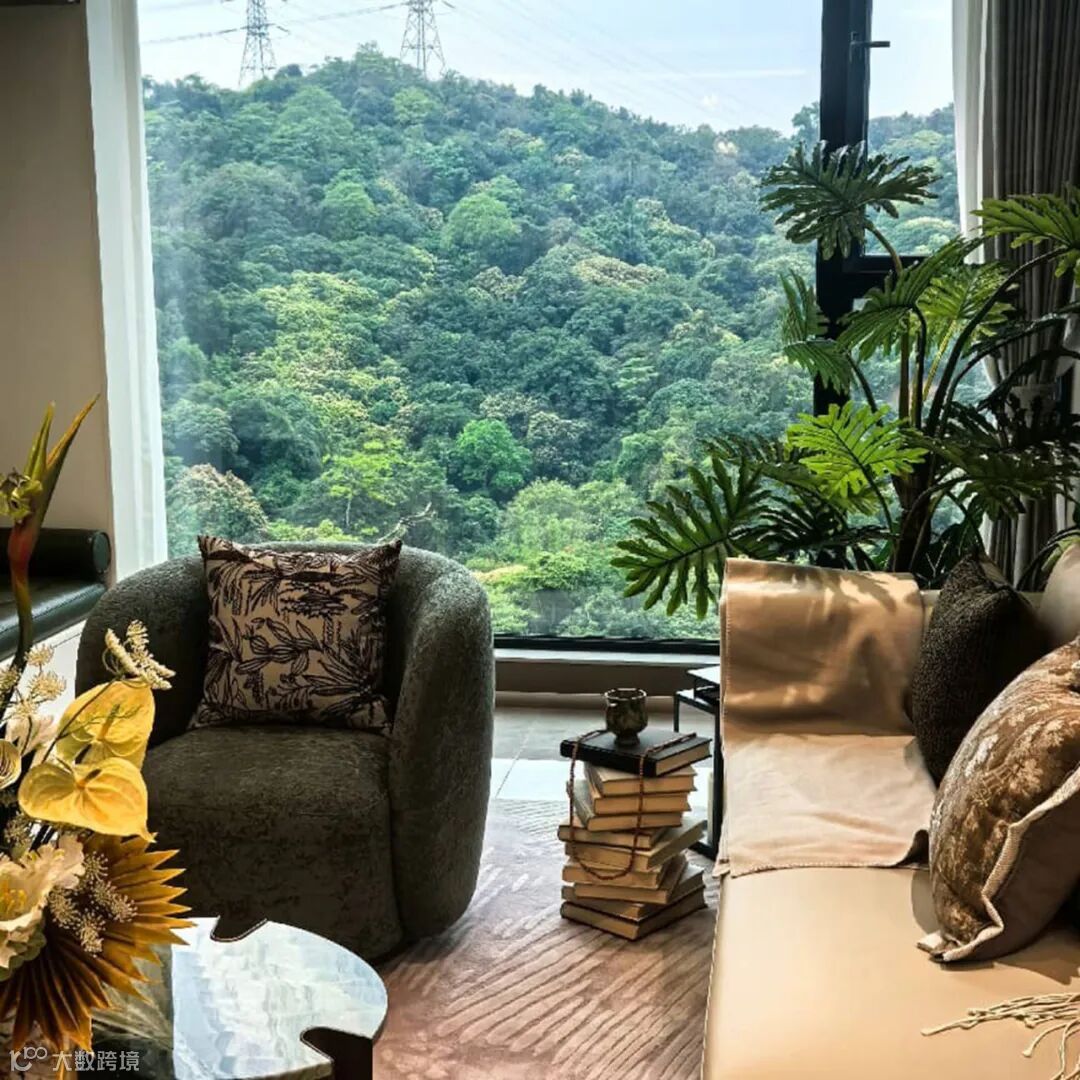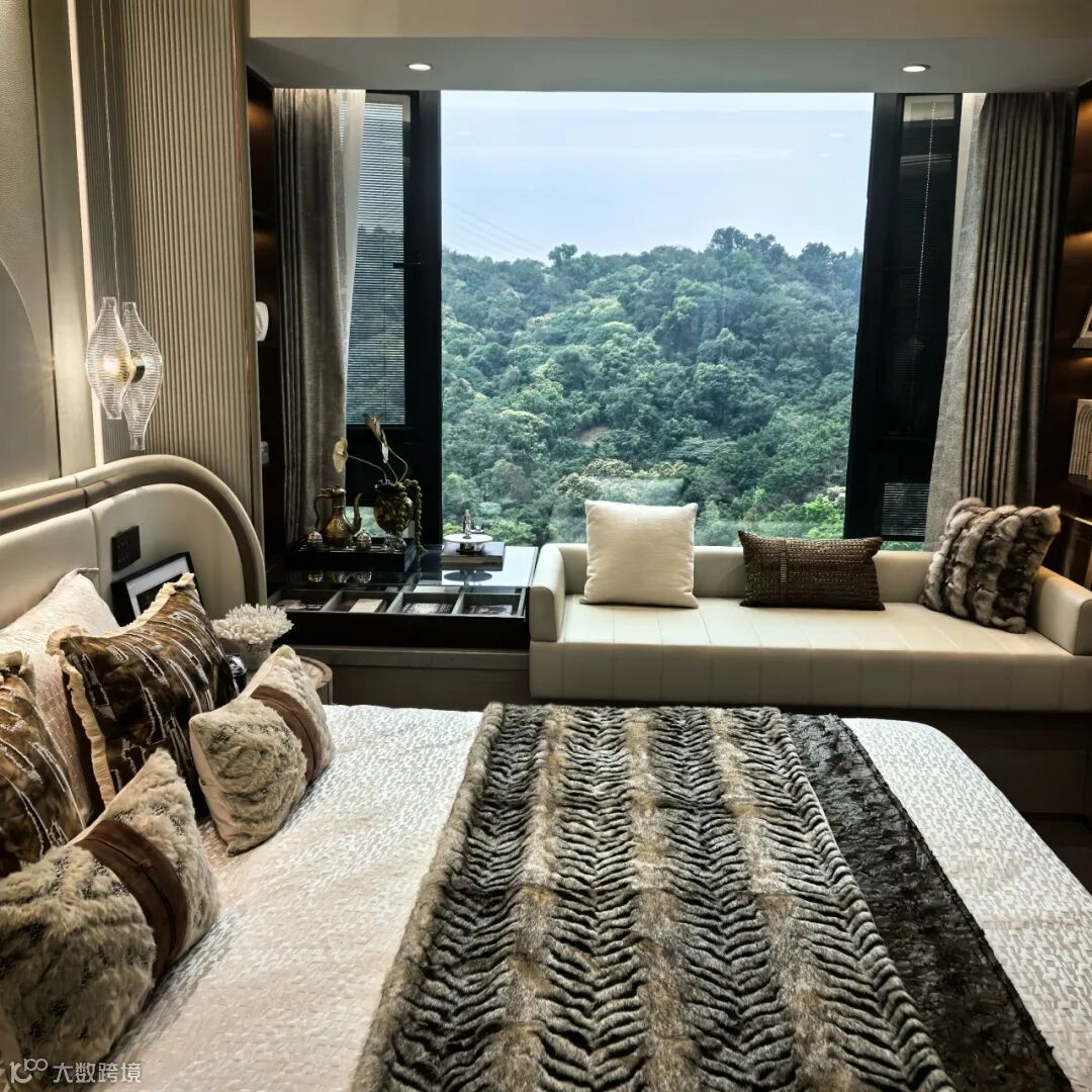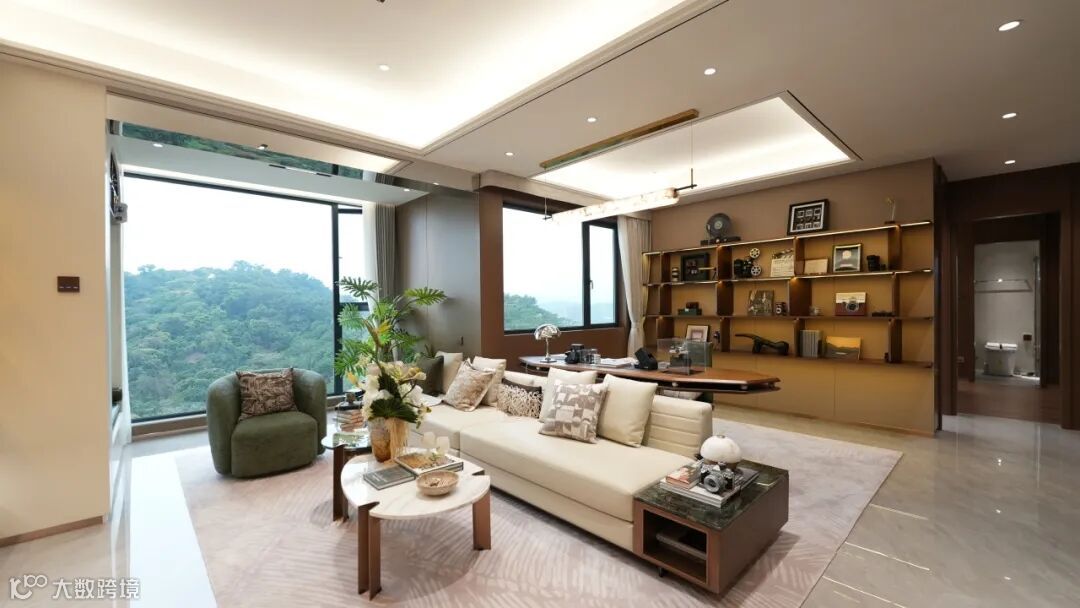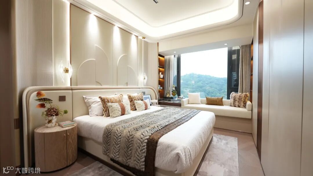 建筑采用现代岭南美学设计,米白、深灰与仿铜铝板交织的立面,质感通透、历久弥新;楼栋依山就势,以45°旋转排布,实现户户朝南,最大化将山景、园景引入室内,推窗即见满目绿意,每一户都拥有专属“自然观景台”。
