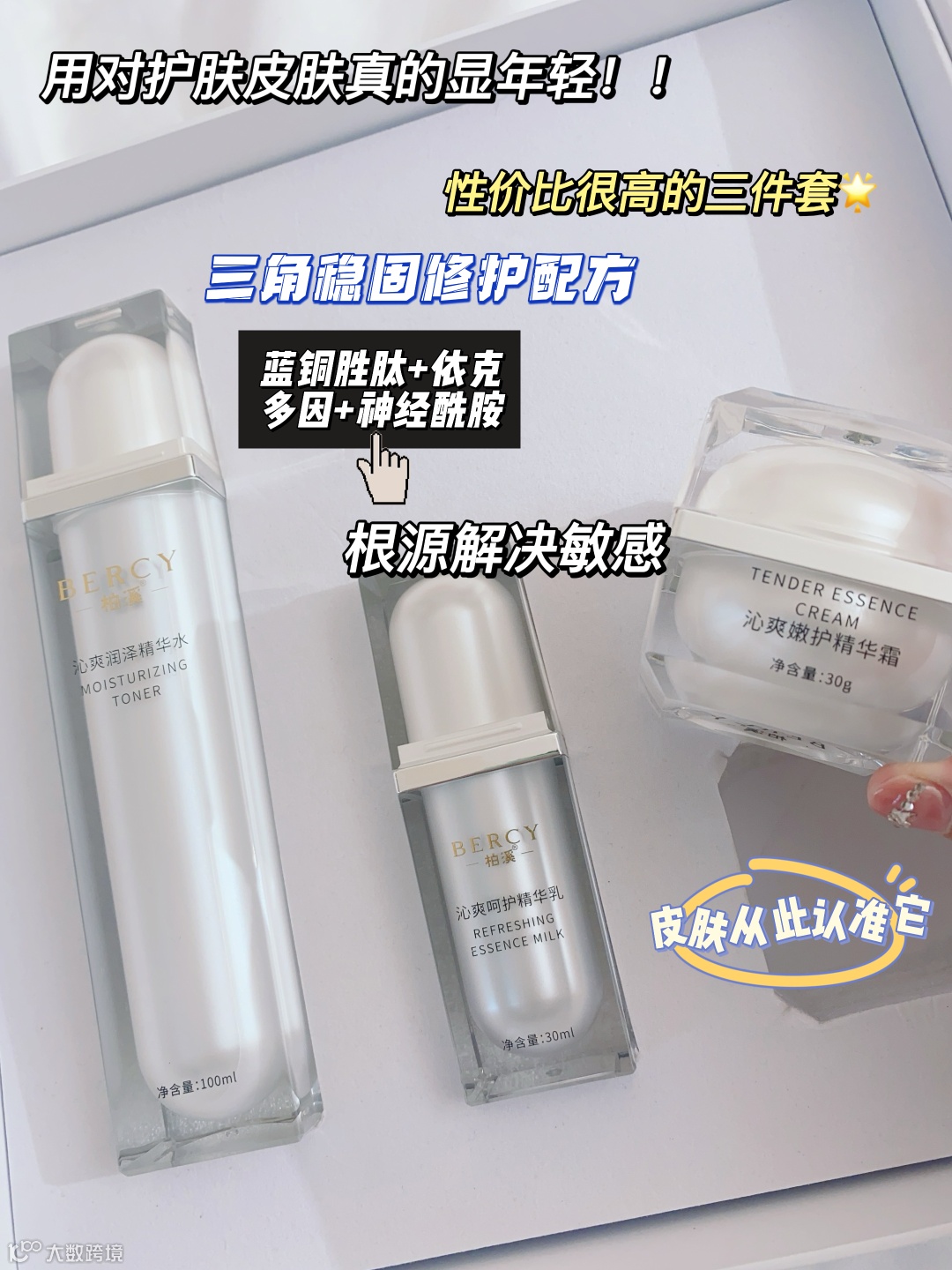 柏溪的沁源套装又被叫做“白月光”组合,采用独特的三角稳固修护配方——蓝铜胜肽+依克多因+神经酰胺。这三重成分合力,从多方位修护受损肌肤,阻止伤害、抑制敏感、保护屏障,让肌肤迅速恢复健康状态,重现原生光彩。