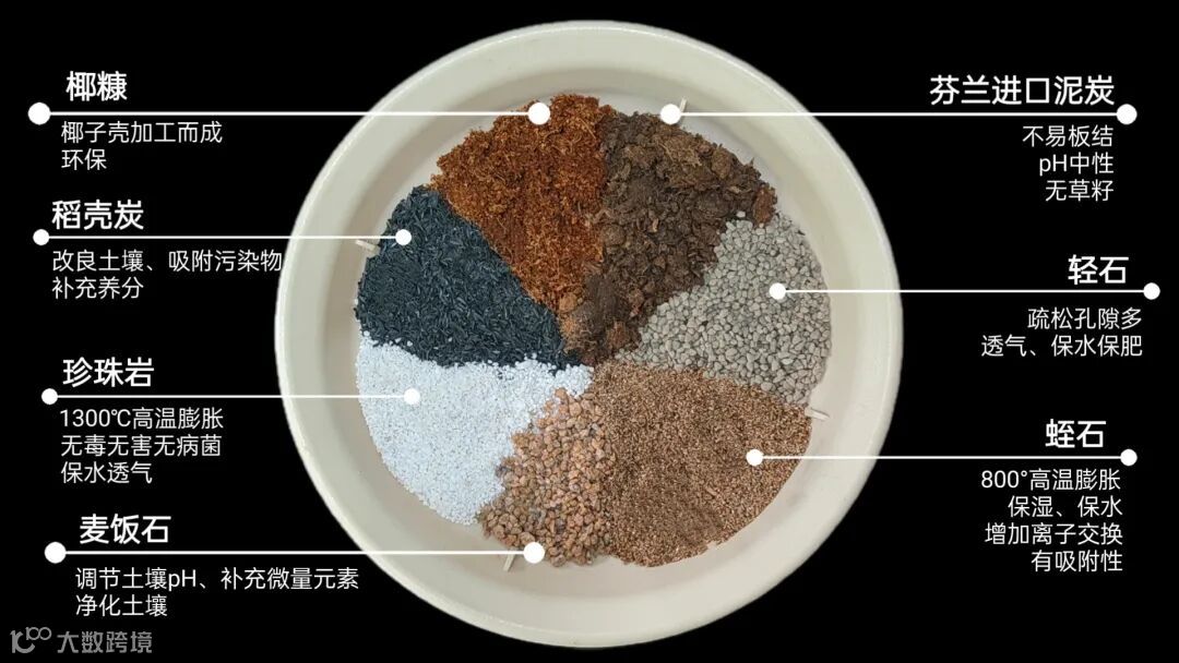 由进口泥炭、椰糠、轻石、珍珠岩、稻壳炭、蛭石、麦饭石混配而成。成分清晰可见,拒绝有害杂质,确保土壤纯净无污染。