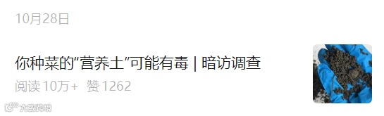 10月28号,澎湃新闻影子调查队发布了关于有毒营养土的调查,揭露了市场上“毒营养土”的产业链,引起了广大人民的关注。