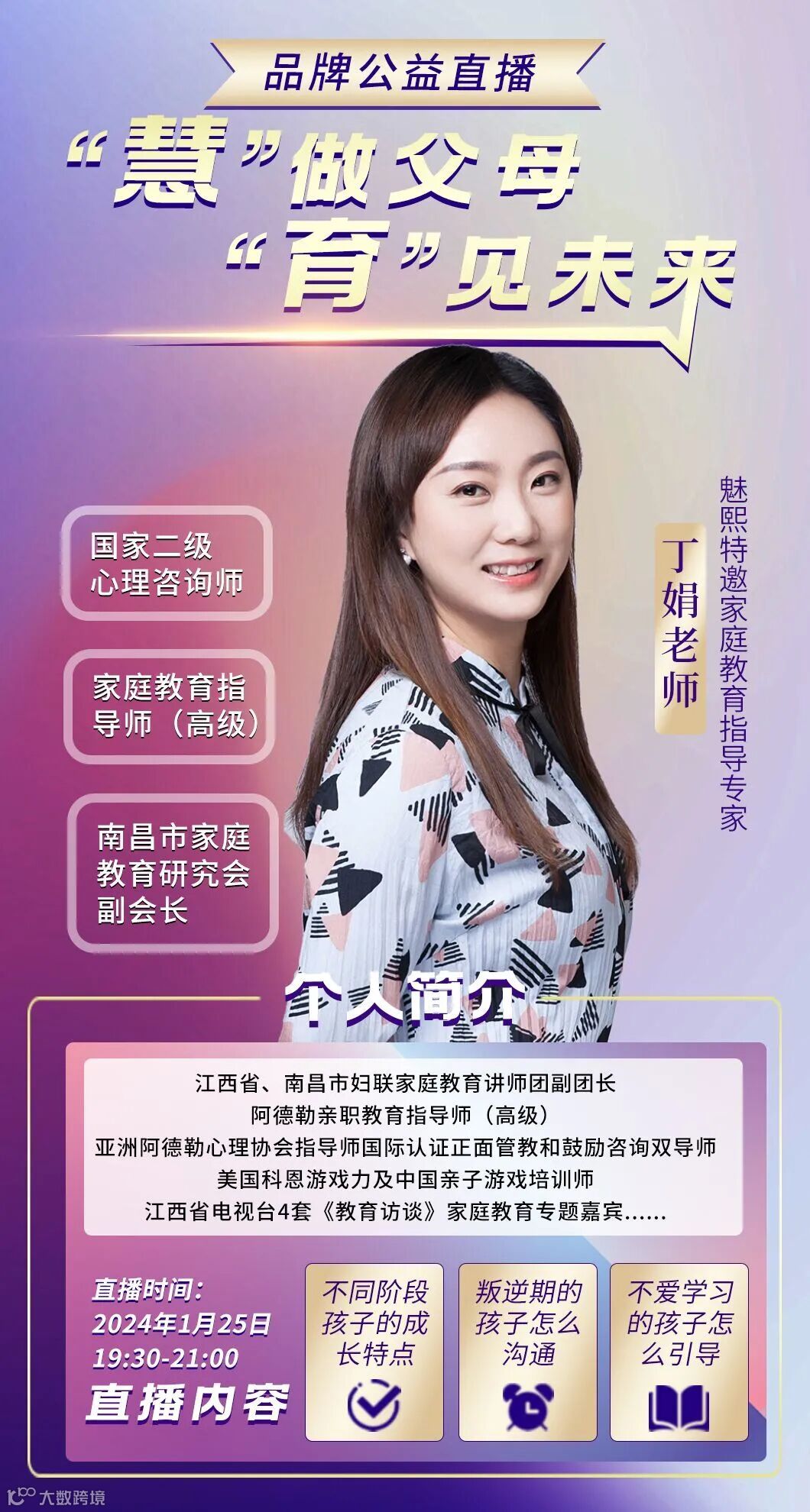 我们邀请丁娟老师,于本月25日晚上7点30分,做客魅熙品牌直播间。丁娟老师将现场解答各种亲子关系问题。大家有任何亲子问题,都可以在评论区留言,直播期间可优先解答!