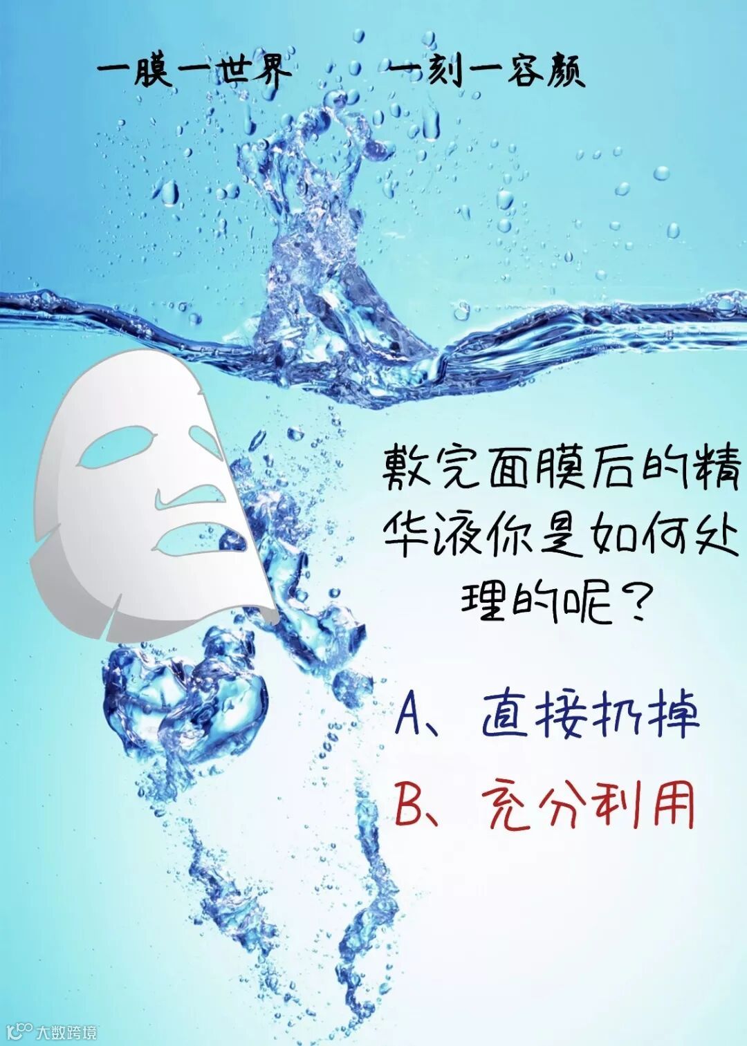 也许你是刚开始护肤的小朋友,也许你是不经常护肤的小白,所以经常感觉到面膜中的精华液好像很多,然后扔掉了。这种做法是错误的,一片面膜中,其实我们的营养成分都在精华液之中,我们吸收到的也是精华液中的营养成分,所以我们可以用它敷在我们的手臂、脖颈等等地方,切记不可扔掉!