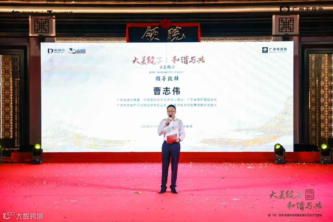 紧接着,广东省政协常委、广东省新阶联副会长、中国国际经济交流中心理事、广州市房地产行业协会常务副会长、新城市投资控股集团联合创始人曹志伟先生上台致辞。在感谢了到场嘉宾和演出的艺术家后,曹志伟分享了新城市投资控股集团三十年来坚持用心造“6G”好房子的初心,并表示市委市政府和天河区委区政府对企业高质量发展的支持给了新城市投资控股集团继续投资天河、投资广州的信心。此外,曹志伟提到,目前购房政策宽松以及金融城千亿投资的加持,现在是置业广州、置业天河、置业金融城的好时机!曹志伟的发言赢得现场阵阵掌声。