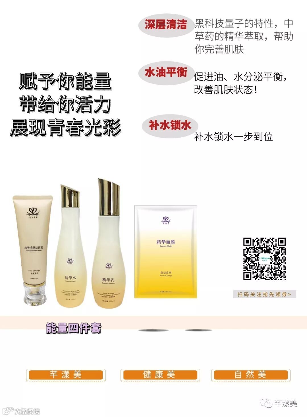 量子护肤品主要是通过激发人体自愈系统及机体的自我修复功能,可以直接进入细胞内部,发挥深层次的、强大的作用,达到就快速、安全、自然、逆转衰老。实现人体皮肤组织的正常功能,从而达到皮肤抗衰老的美容作用,促进细胞新陈代谢,调理面部肌肤经络气血,修复皮肤,增强抵抗力,延缓衰老,赋予肌肤紧实强韧、润白亮泽。