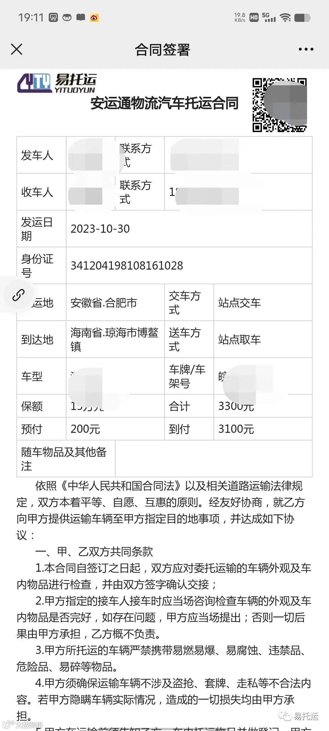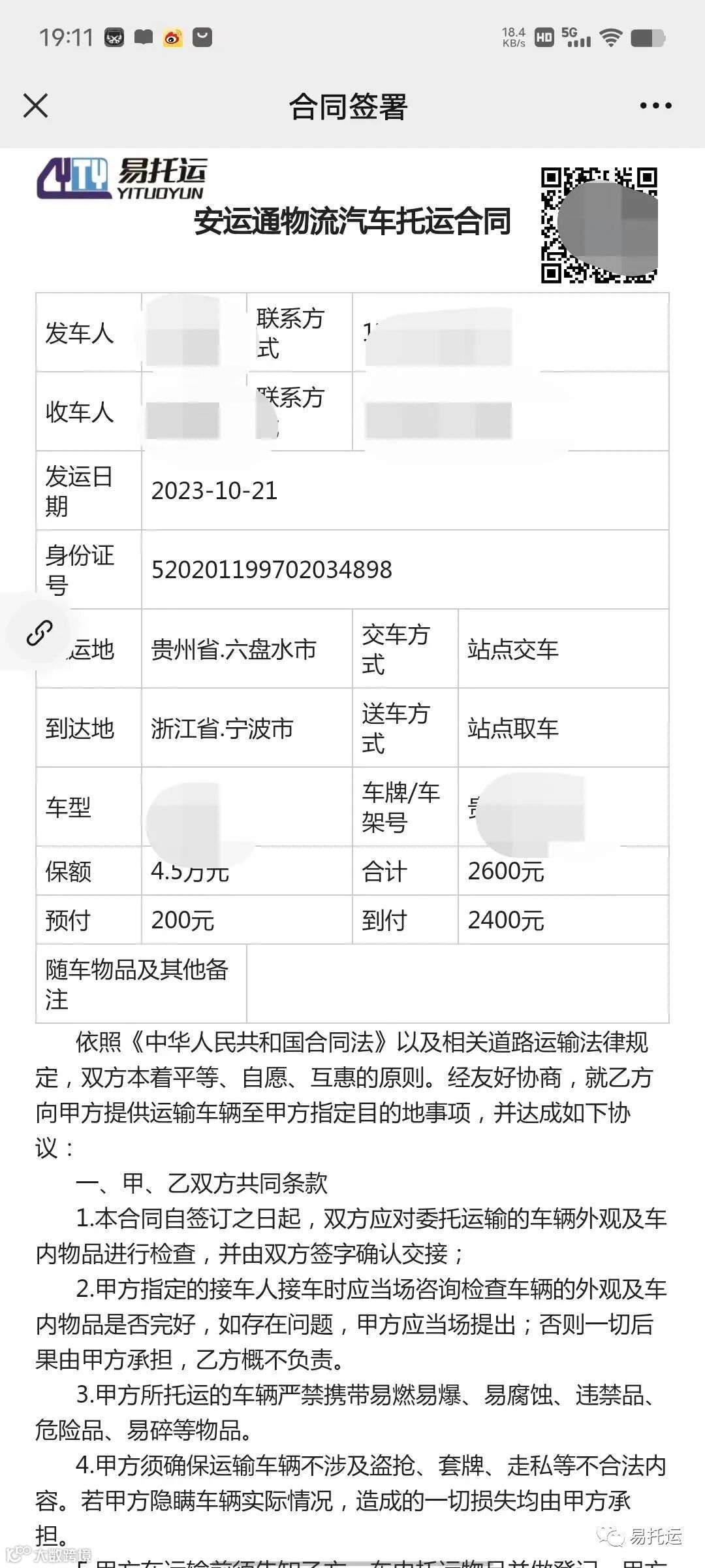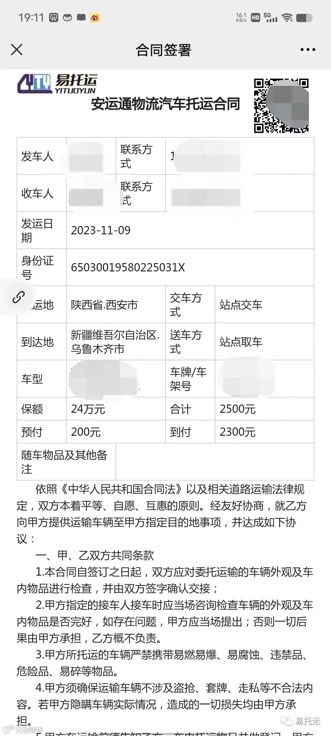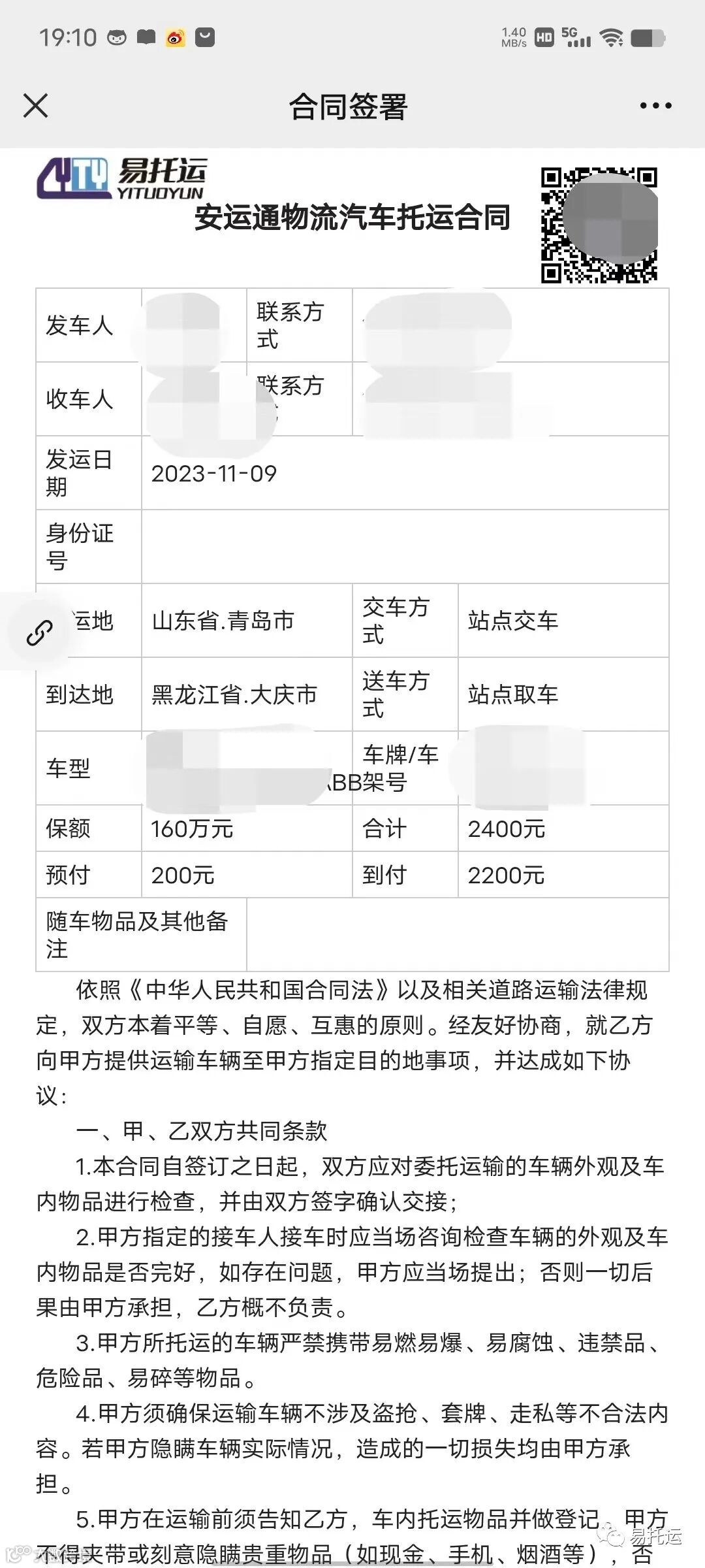 如果您下单成功,我们会有客服小姐姐和您取得联系,告诉您签订合同的方式,非常简单,只需填写您爱车的运输资料,即可。每单产生一个二维码,方便随时查看保存哦!