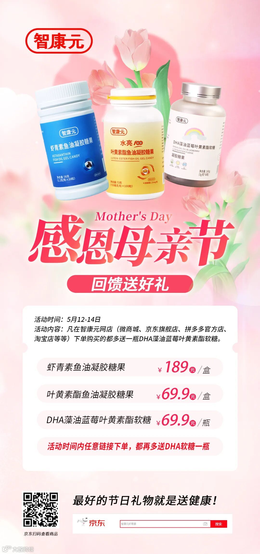 活动内容:凡在智康元网店(微商城、京东旗舰店、拼多多官方店、淘宝店等等)下单购买的都多送一瓶DHA藻油蓝莓叶黄素酯软糖。