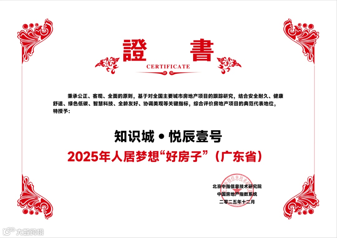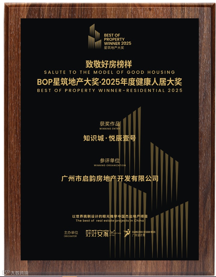 除此之外,悦辰壹号还先后荣获“BOP星筑地产大奖·年度健康人居大奖”及北京中指信息技术研究院颁发的2025年人居梦想“好房子”(广东省)等多项权威荣誉。