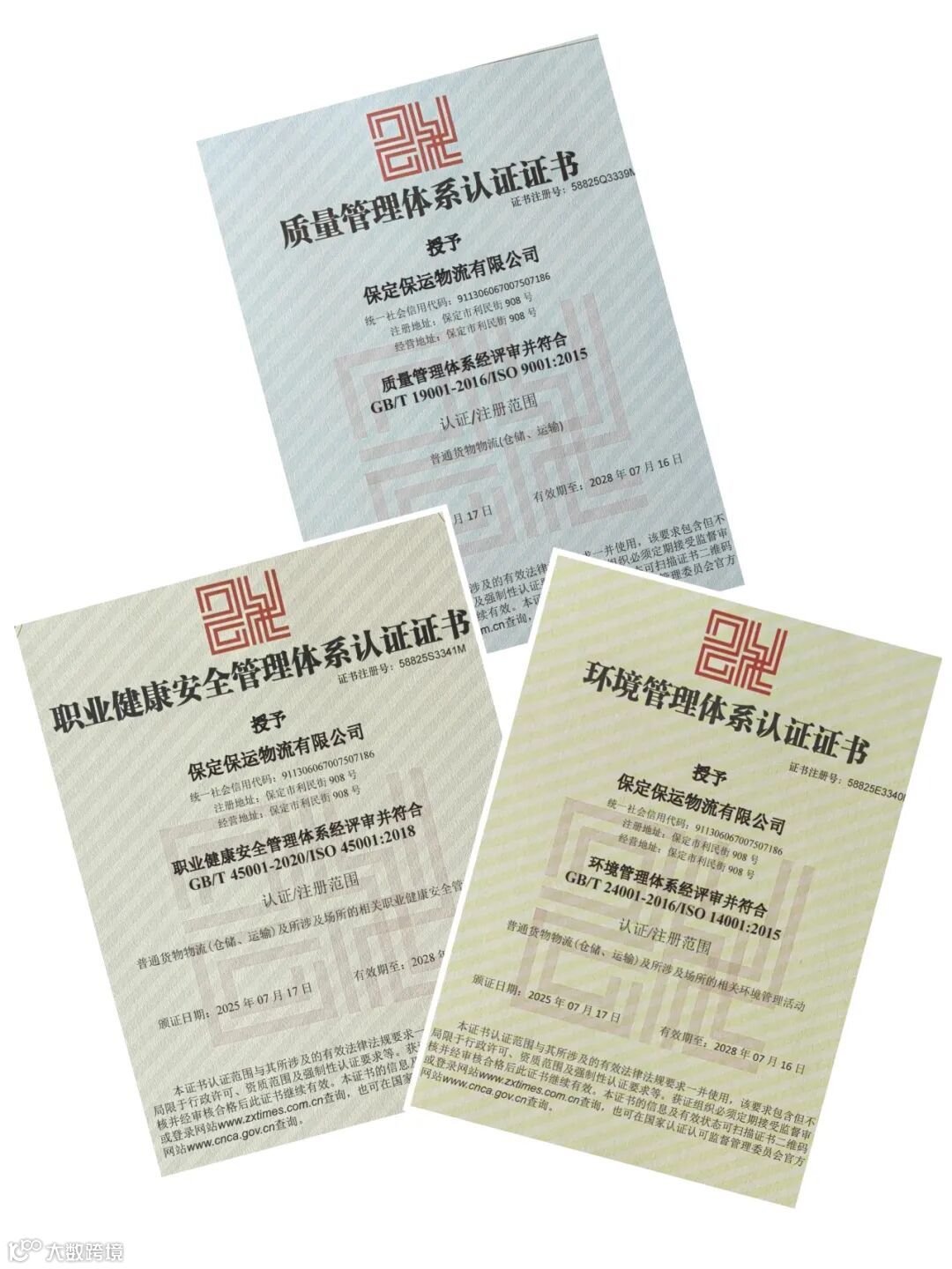 近日,保运物流公司正式获得 ISO 9001质量管理体系、ISO 14001环境管理体系及ISO 45001职业健康安全管理体系认证证书,标志着保运物流公司在规范化、标准化和可持续发展方面迈出坚实一步。