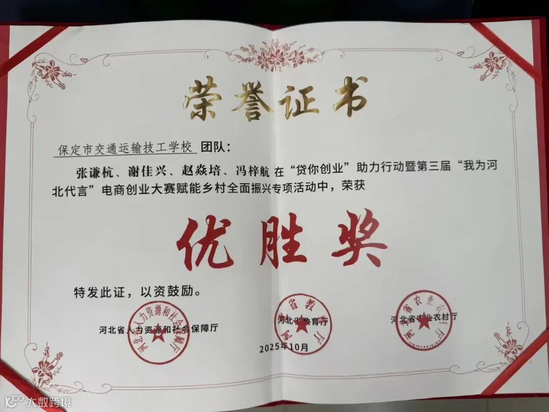近日,河北省“贷你创业”助力行动暨第三届“我为河北代言”电商创业大赛乡村振兴专项活动获奖名单正式公布。保定交通技工学校电子商务专业师生团队凭借出色表现,荣获大赛优胜奖。