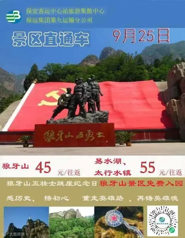 客运中心站开通景区直通车狼牙山往返票价45元,易水湖、太行水镇往返55元。