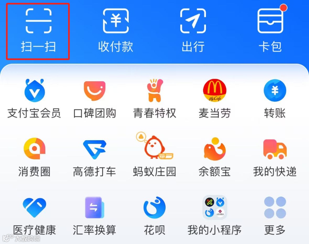 打开支付宝APP,点击首页左上角“扫一扫”功能。