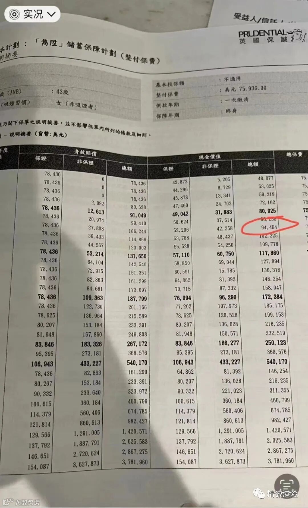 而当时计划书上演示的数值为94464,所以真实的总现金价值比率为101.1%