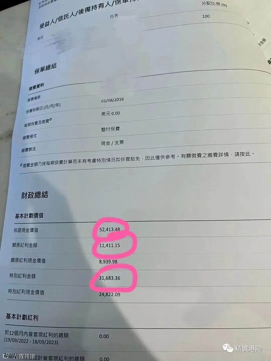 真实的客户保单分红