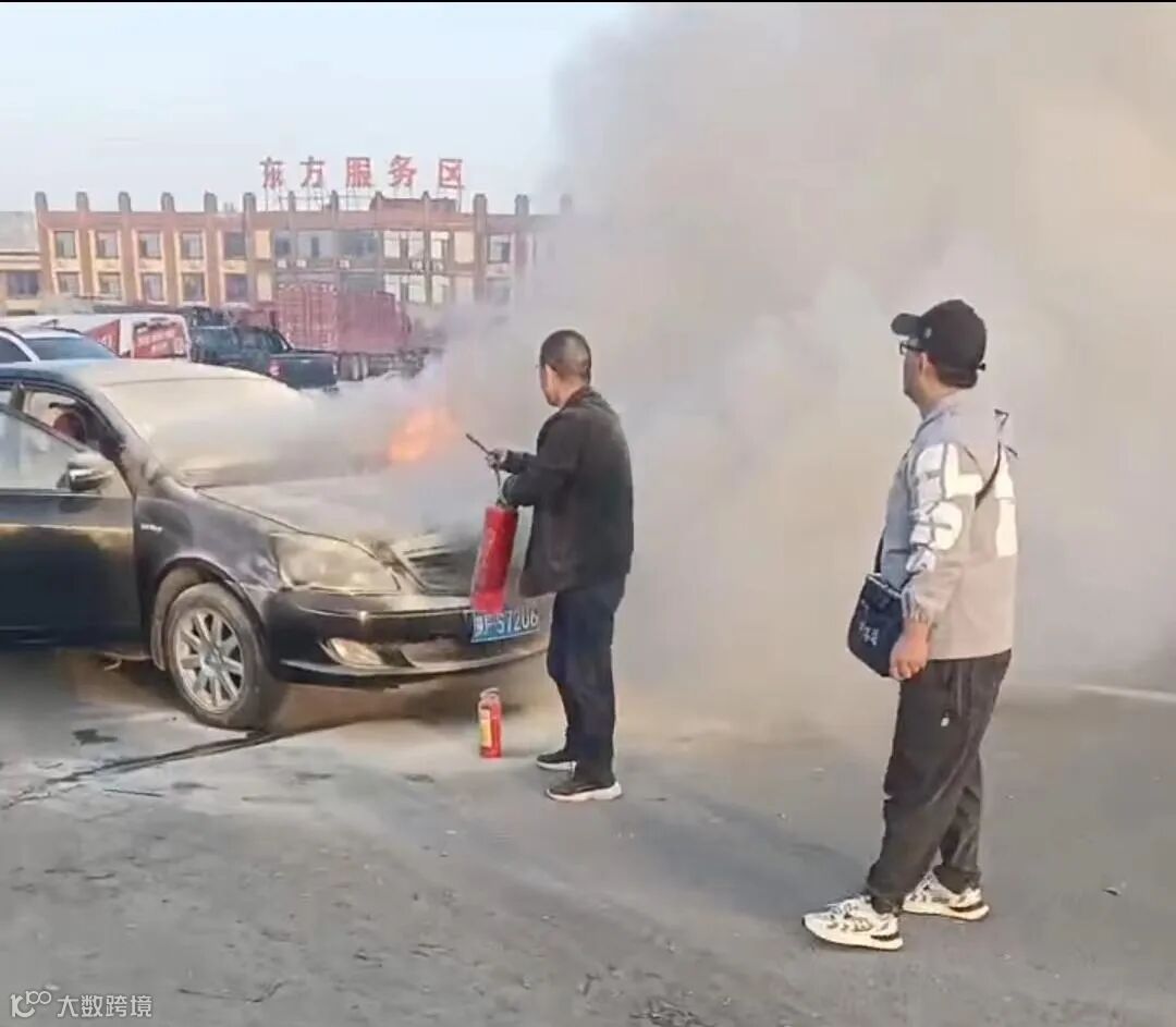 10月11日清晨,107国道东方服务区附近上演了一场惊心动魄的救援行动。一辆停靠在路边的黑色轿车突然起火,浓烟滚滚,车头部分更是不时冒出熊熊火焰,火势迅速蔓延,形势万分危急。车主在旁焦急万分,试图拦截过往车辆寻求帮助。