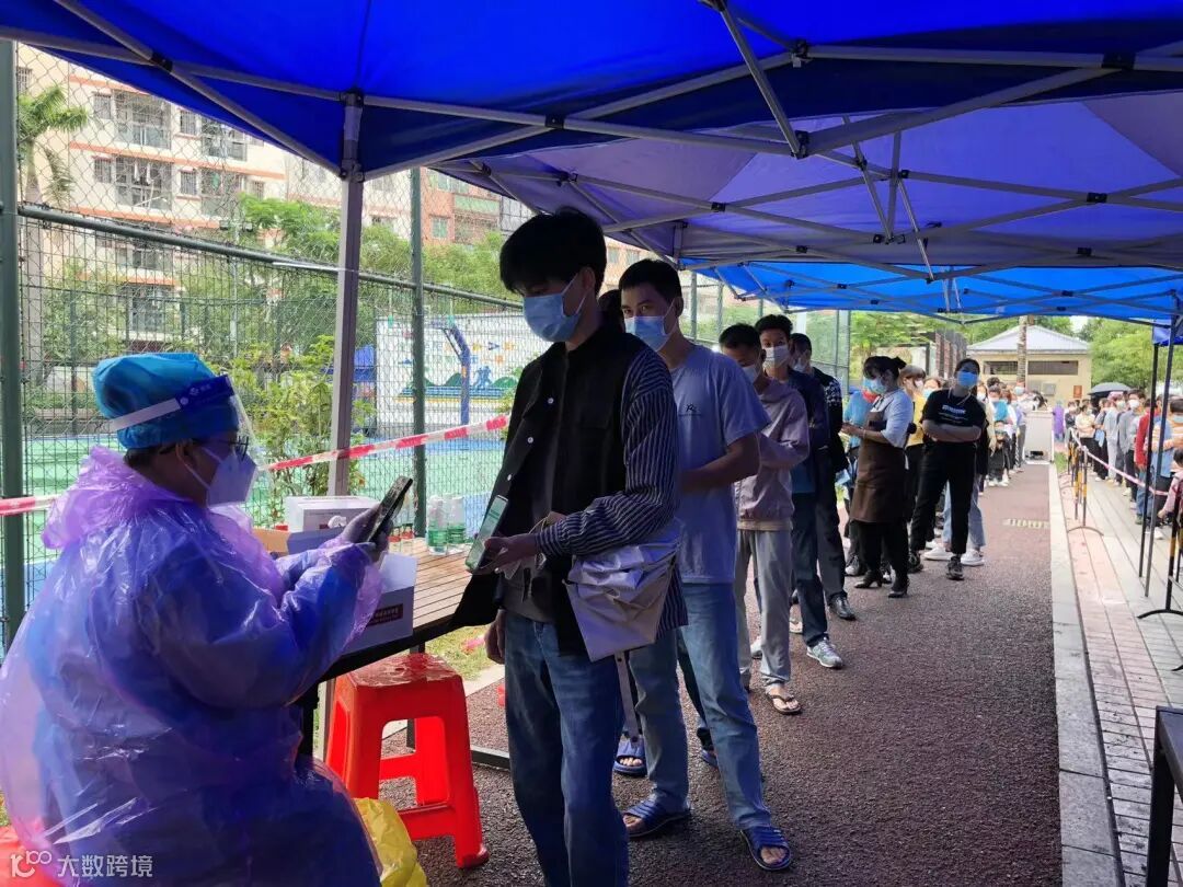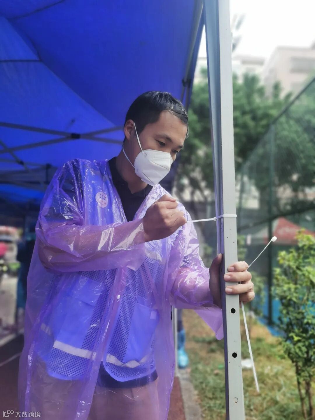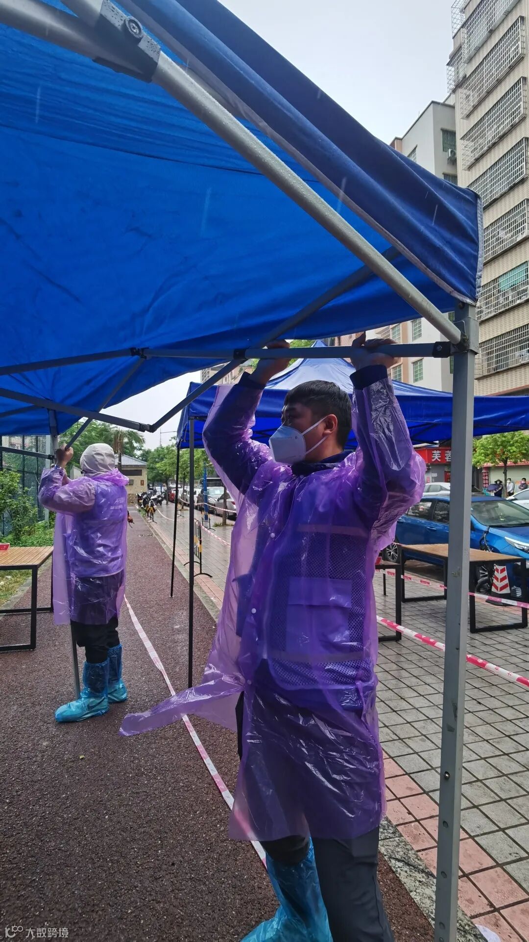 11月2日,支援小队从大源村抵达嘉禾街,区域出现急速降温的阴雨强风天气,但社区大规模核酸检测工作需要落实到位。在大源村支援过程中经受锤炼、默契配合的支援小队士气高涨,接受任务安排后,他们迎着风、冒着雨立即就位开展工作。