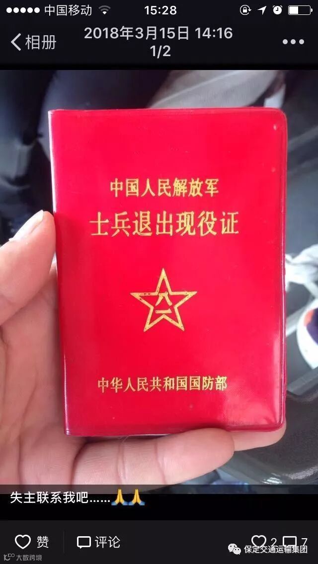 3月21日,九公司涿州线路驾驶员杨保红驾驶冀FE2190号车,在执行完保定至涿州的任务后,整理车辆内务时,在后排的车座上发现了一个鲜红色的士兵退役证。当他小心翼翼地拿起这个退役证的时候,心中的那种对军人的敬佩感油然而生,因为一直以来他有一个军人梦,虽然未能参军,但是每次看到电视上军人保家卫国,保护国民生命财产安全,冲往前线的时候,他总会幻想自己有一天也能够为军人做点什么。眼前,手捧着这个退役证,他激动不已,下定决心一定要想方设法找到这位军人。