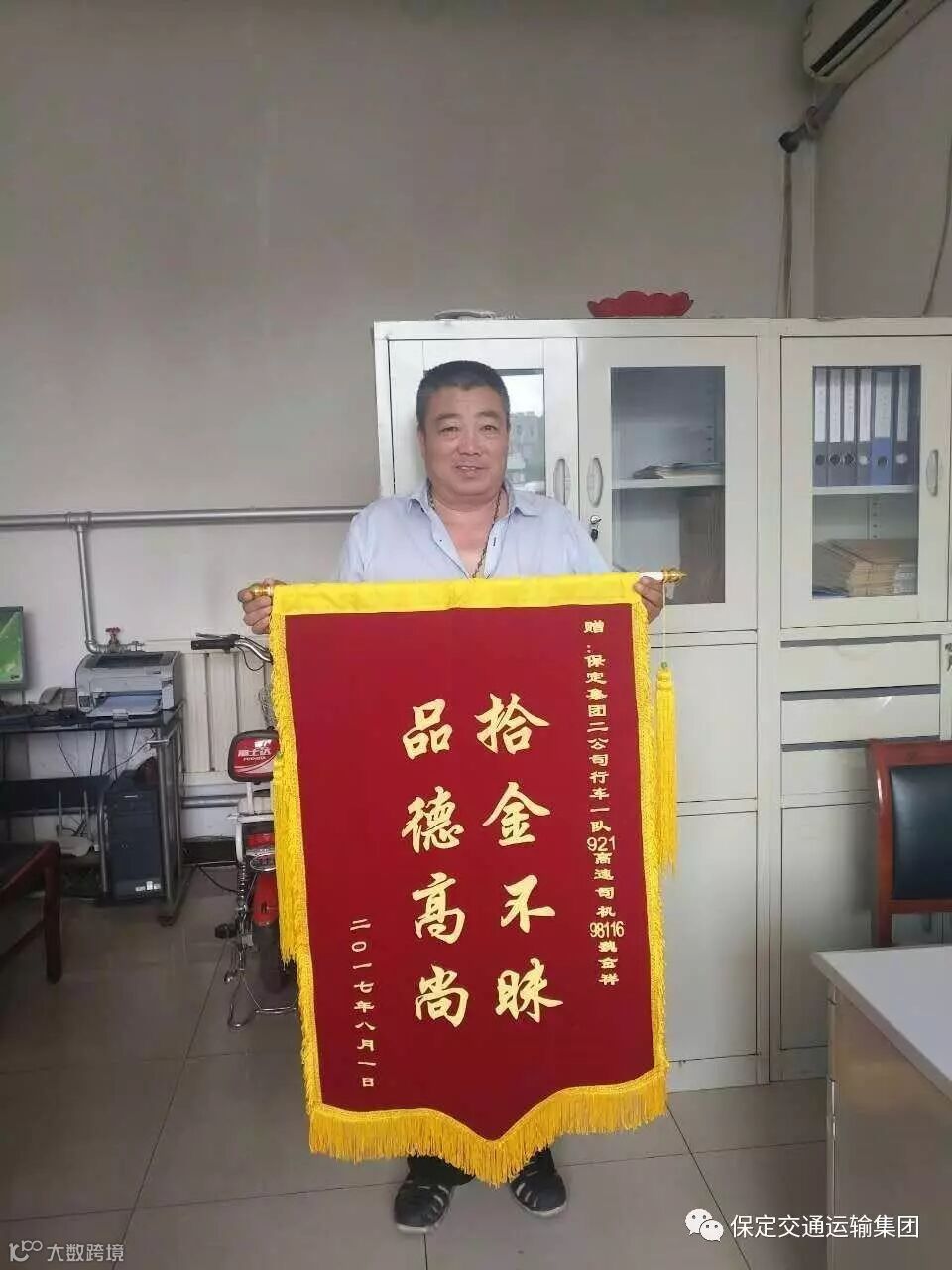 8月16日上午10点,一位年轻小伙拿着一面写有“拾金不昧、品德高尚”的锦旗来到二公司行车一队办公室。
