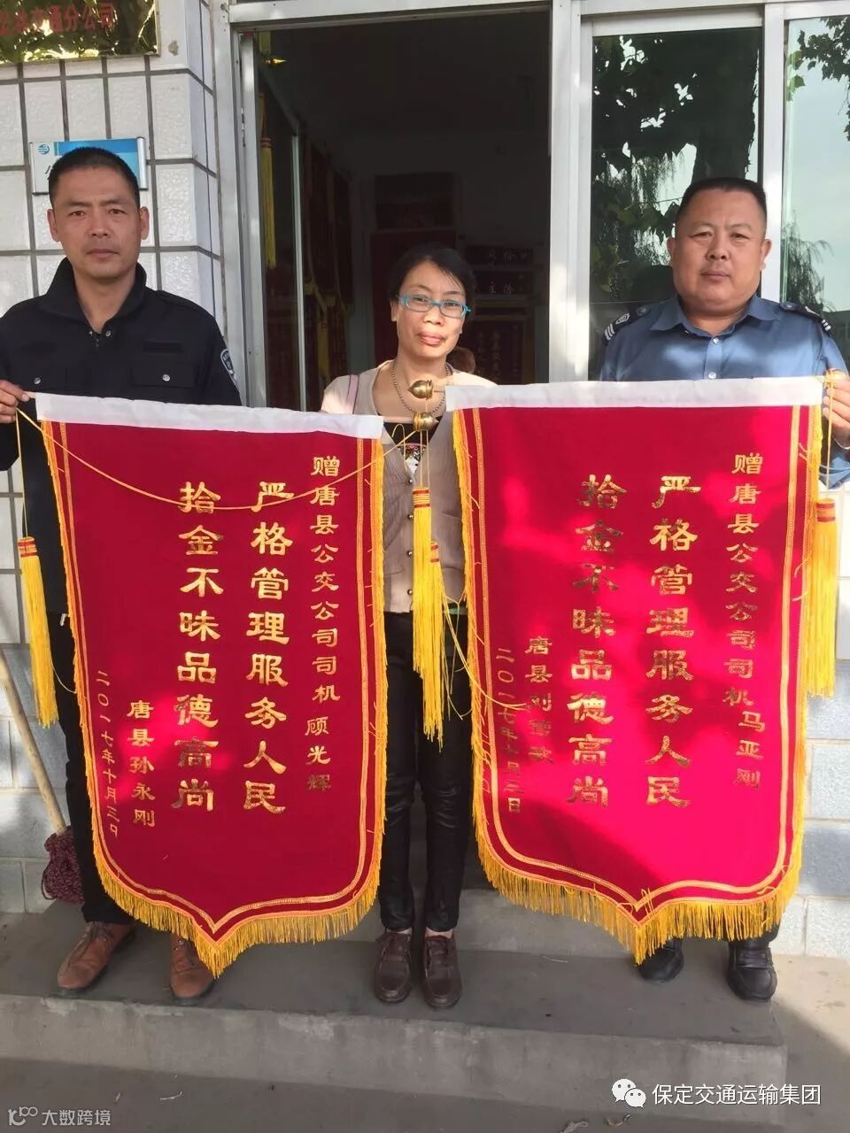10月3日下午3点左右,唐县公交车队同时收到两面锦旗,锦旗同样写着“严格管理服务人民,拾金不昧品德高尚”,一面送给公交司机马亚刚,落款人孙永刚,另一面送给公交司机顾光辉,落款人为刘莺歌。大家百思不得其解的时候,两位乘客道出事情的经过。