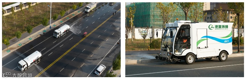 港誉环境采取“机械作业+人工清洗”相结合的模式,采用大型洗扫车、洒水车对城区主要道路路面进行高压冲洗,深度清理路面尘土;利用小型高压冲洗车灵巧的特点,重点对非机动车道、人行道的卫生死角进行冲洗,发挥“人机结合”作业优势,采取一人冲多人扫的方式,做到点面结合、不留作业盲区,同时组织人员对沿线的护栏围栏、垃圾箱、公交站亭等进行擦洗。在集中行动的基础上,坚持常态化规范作业,加强洒水抑尘作业,快速巡回保洁,确保城区道路干净整洁。