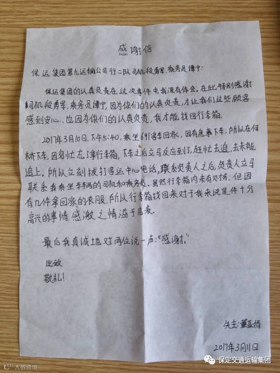 3月11日上午一大早,一位女孩满面春风地走进九公司行车二队队办室,微笑着说:“请问这是行车二队吧?”队长苑虹明放下手中的电话说:“是的,请问您有什么事情?”女孩欣喜而又激动地说:“我是特意来向段永军师傅致谢的。昨日下午,我乘坐691客车回家,因临时有急事,就在何桥下了车,匆忙中把行李箱落在了车上,虽然里面没有贵重的财物,但是有我买给母亲的生日礼物——几件衣服,意义重大。若不是段师傅援手相助,行李箱怎能失而复得,谢谢公司培养出了这么优秀的员工,世上还是好人多呀!”边说着,边从口袋里掏出一封感谢信,苑队长接过信亲和地说:“不用客气,帮助旅客找回丢失的物品是我们应尽的职责。”