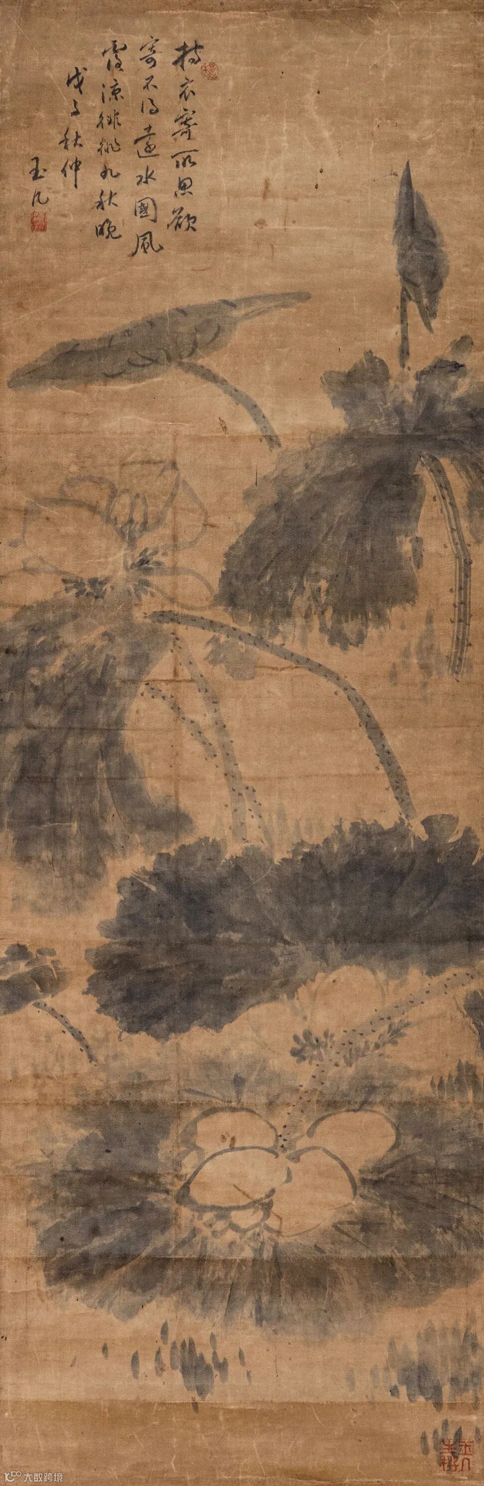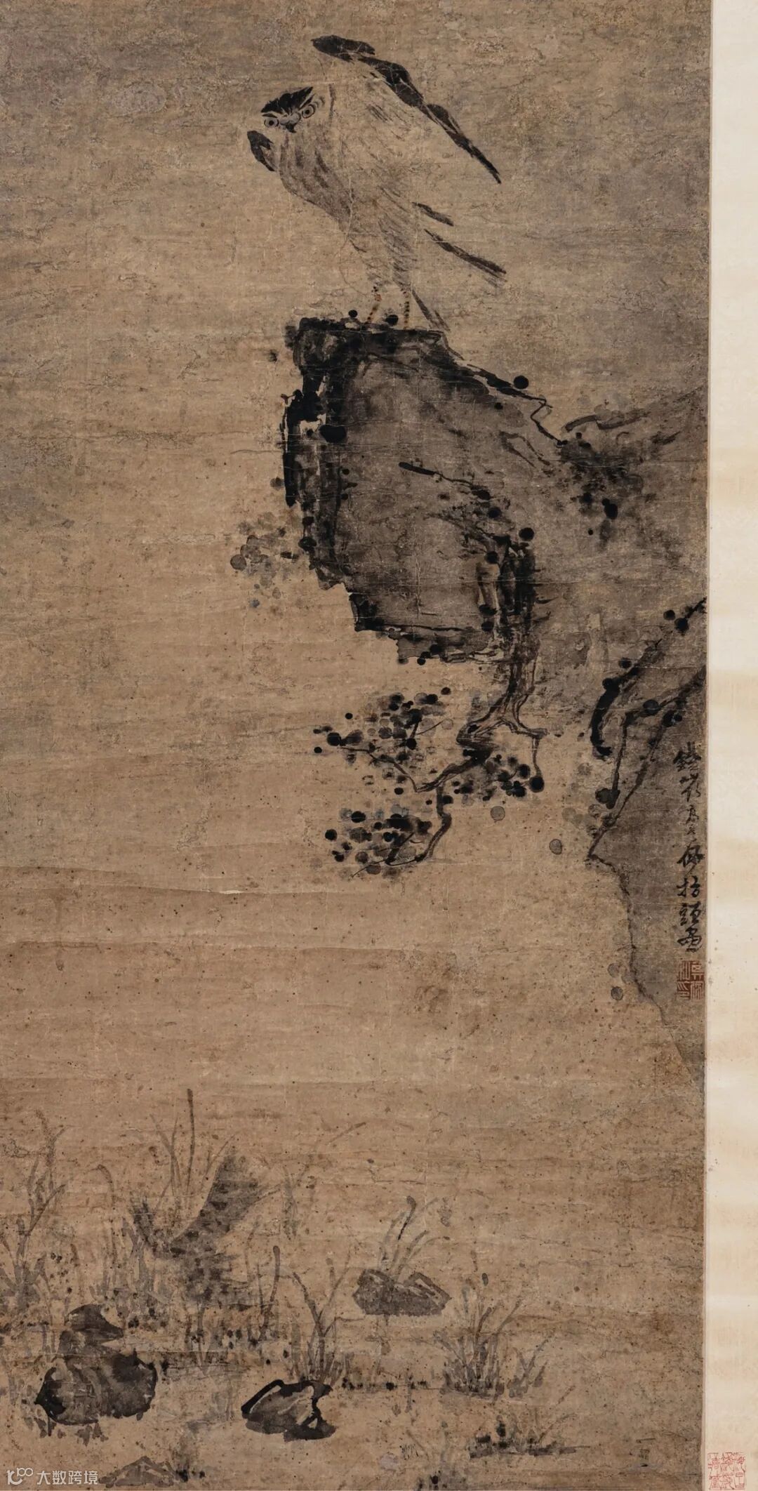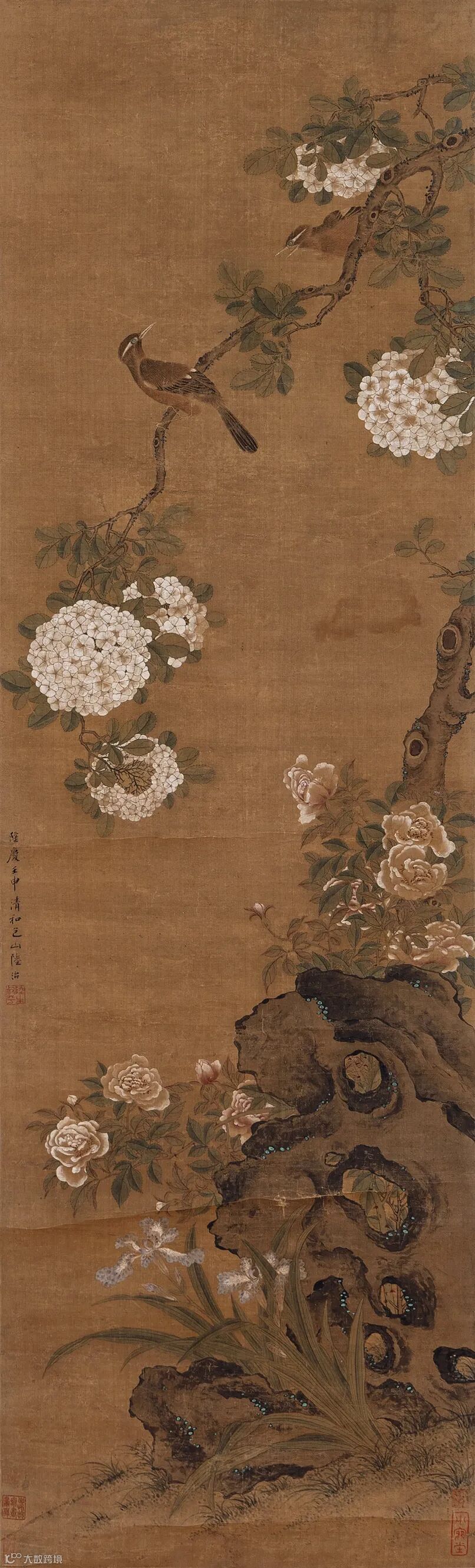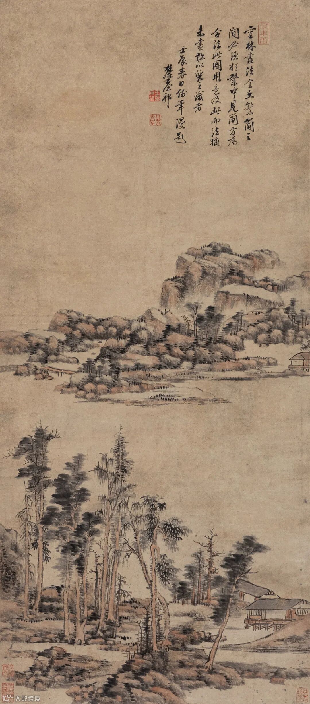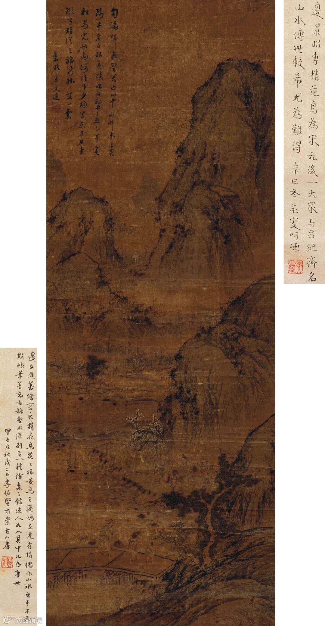 题跋:1.边景昭专精花鸟,为宋元后一大家,与吕纪齐名,山水传世较希,尤为难得。辛巳冬芚叟呵冻。