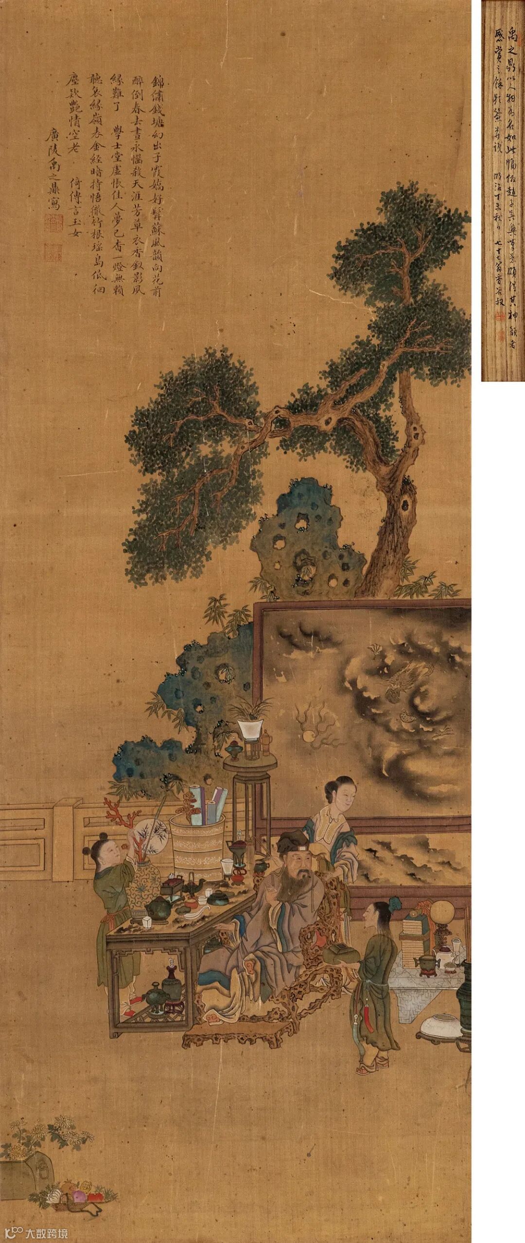 款识:锦绣钱塘,幻出子霞娇好。髯苏风韵,向花前碎倒。春去昼永,恼杀天涯芳草;衣香钗影,夙缘难了。学士堂虚,怅佳人梦已杳。一灯无赖,听哀缘领表。金经暗持,悟彻竹根瑶岛;低徊尘埃,艳情空老。倚《傅言玉女》。广陵禹之鼎写。