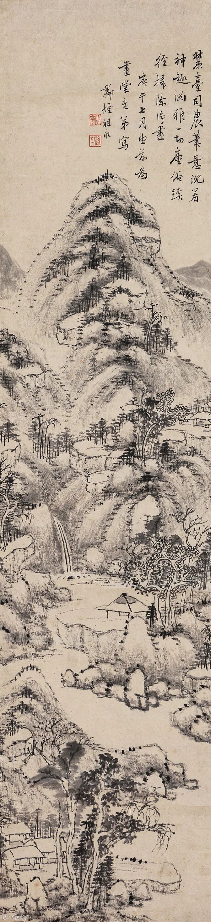 款识:麓台司农笔意沉着,神趣渊雅,一切尘俗蹊径扫除净尽。庚午七月既望前为昼堂老弟写,邻烟祖永。