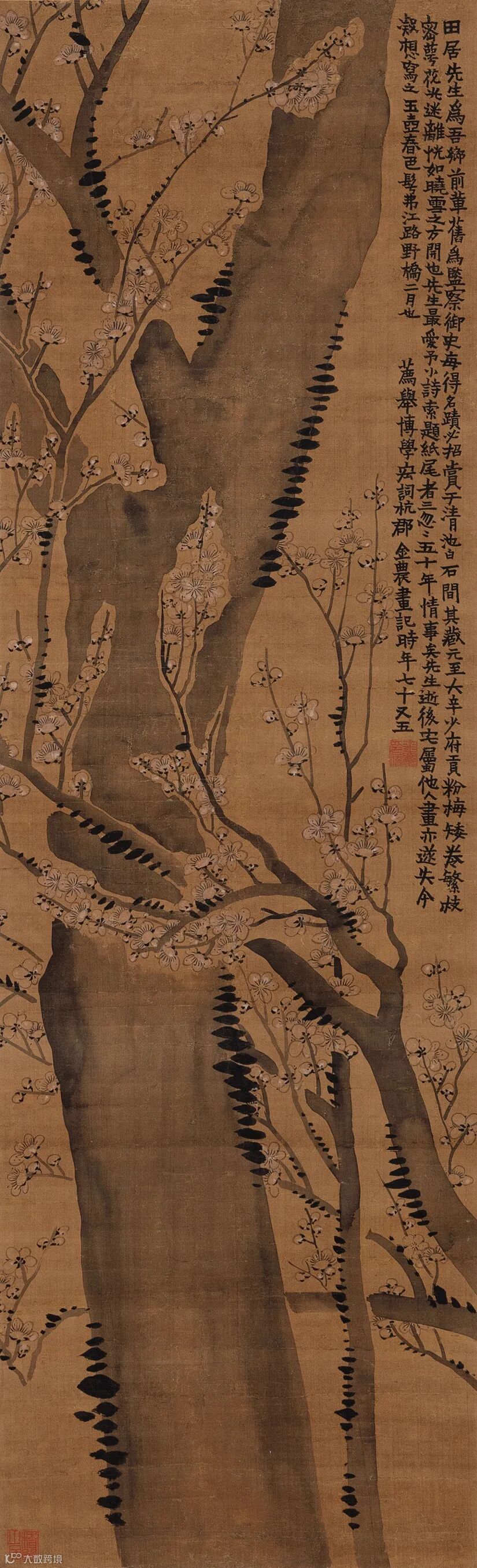 款识:田居先生为吾乡前辈,旧为监察御史,每得名迹,必招赏于清池白石间。其藏元至大辛少府贡粉梅矮卷,繁枝密萼,花光迷离,恍如晓雪之方开也。先生最爱予小诗,索题纸尾者三,忽忽五十年情事矣。先生逝后,宅属他人,画亦遂失,今凝想写之,玉壶春色仿佛江路野桥二月也。荐举博学宏词,杭郡金农画记,时年七十又五。