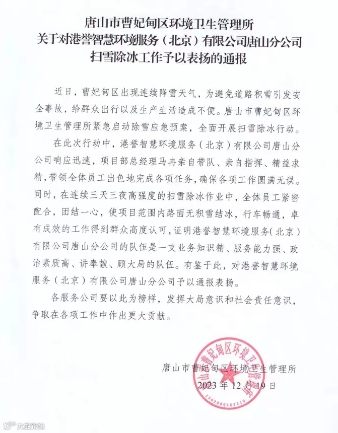 为进一步提升城市环卫服务水平,创造更加干净、整洁、优美的城市环境,港誉环境建立建全环卫长效管理机制,强化街面日常管理手段,以精细化、高品质的环卫服务,助力唐山市常态化创城工作,全力提档升级城市环境容貌,为推动城市管理与运营升级贡献力量,并以优异表现获得唐山市曹妃甸区城市管理综合行政执法局颁发“2023年度先进集体”称号、“城企携手 共筑文明”锦旗、“扫雪除冰工作”表彰等多项荣誉。