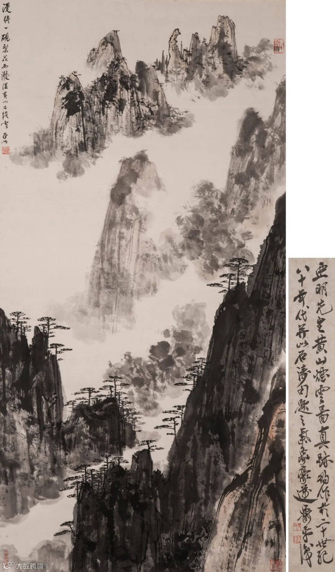 边跋:亚明先生黄山烟云图真跡,约作于二十世纪八十年代,并以石涛句题之,气象豪迈。萧平识。