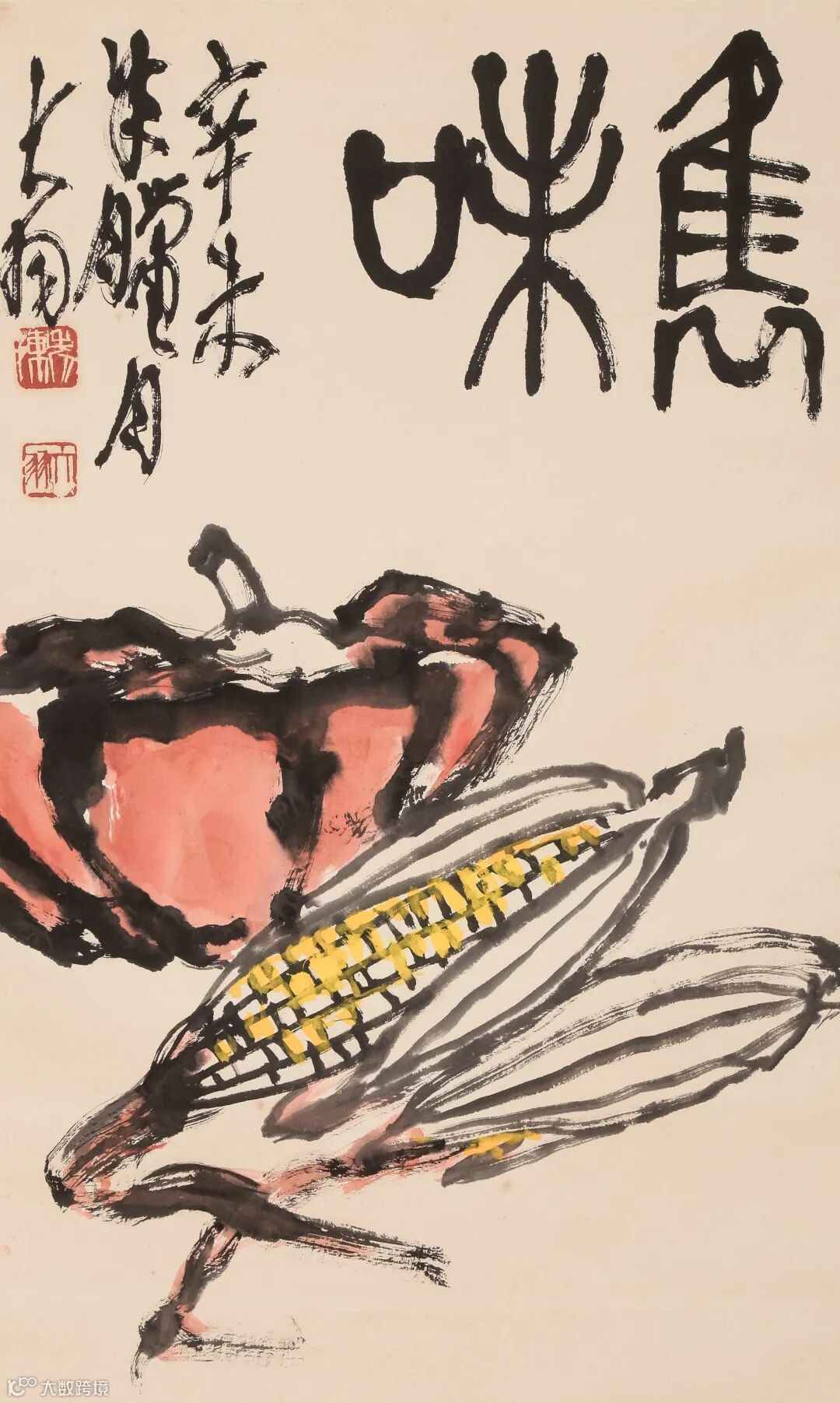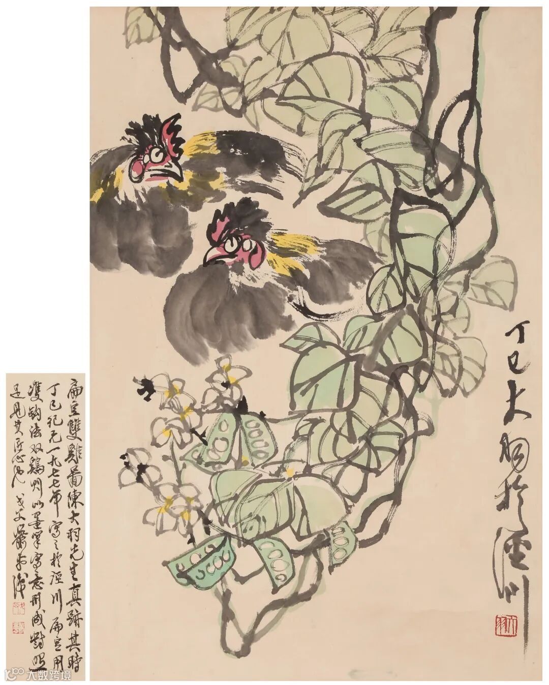 边跋:扁豆双雞图陈大羽先生真跡,其时丁巳纪元一九七七年,写之于泾川,扁豆用双钩法,双鷄则以墨笔写意形成对照,足见其匠心也。戈父萧平识。