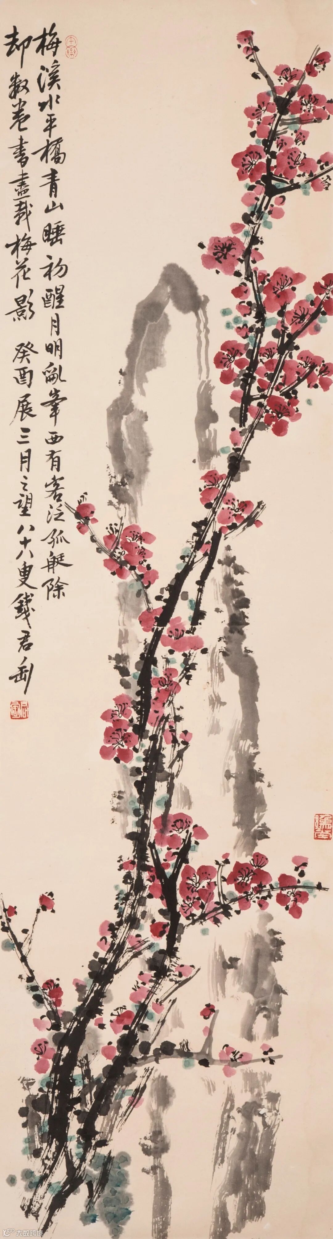 款识:梅溪水平桥,青山睡初醒。月明乱峰西,有客泛孤艇。除却数卷书,尽载梅花影。癸酉展三月之望,八十八叟钱君匋。