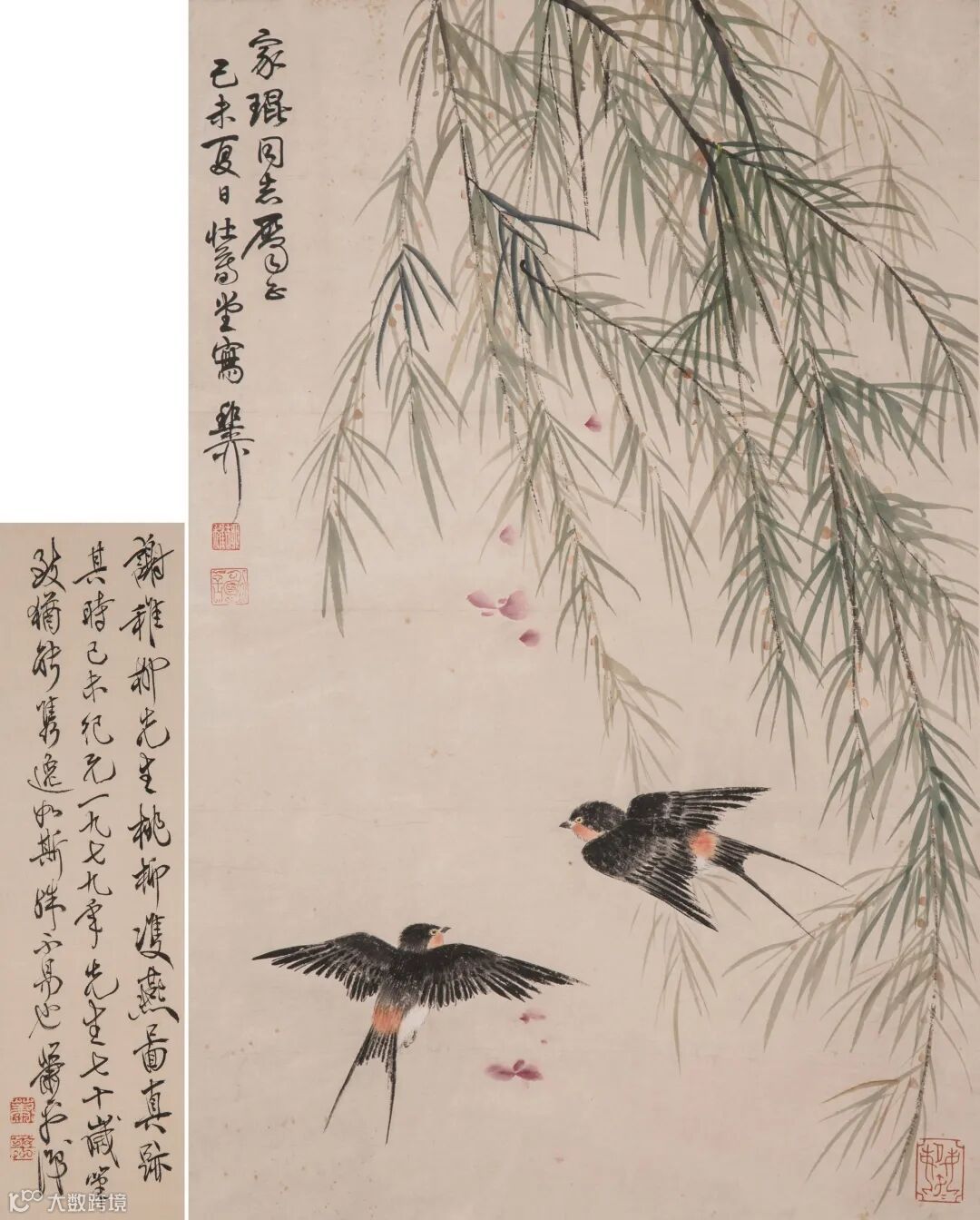 边跋:谢稚柳先生桃柳双燕图真跡,其时己未纪元一九七九年,先生七十岁,笔致犹能隽逸如斯,殊不易也,萧平识。