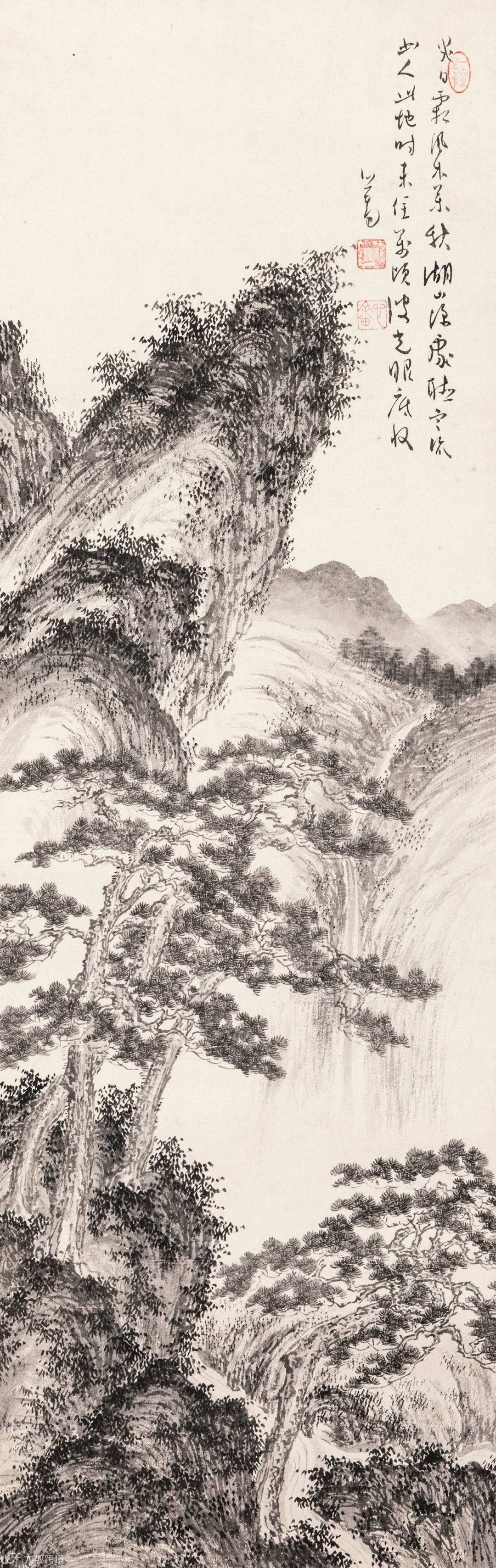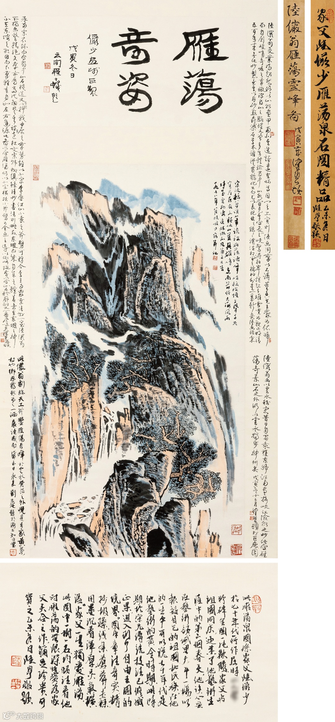4.此雁荡泉图系家父陆俨少于七十年代所作,届时***粉碎,全国一片欢腾,家父与祖国同庆,迎来了他艺术生涯中的第二个春天,他决心要在艺术领域里大干一场,以报效自己的祖国和民族,在他的一生中可以说七十年代是他艺术的黄金时期,此时期于宋元传统技法已修成正果,进入到了自由王国的境界,图中章法奇突,精妙极臻,线条苍莽老辣,用墨沉着雄厚,灵气横溢。家父一生独爱雁荡,此图中一树一石,均倾注着他对雁荡的无限深情,实为家父天合之作,弥足珍贵可宝之。乙未冬日,陆亨敬题。