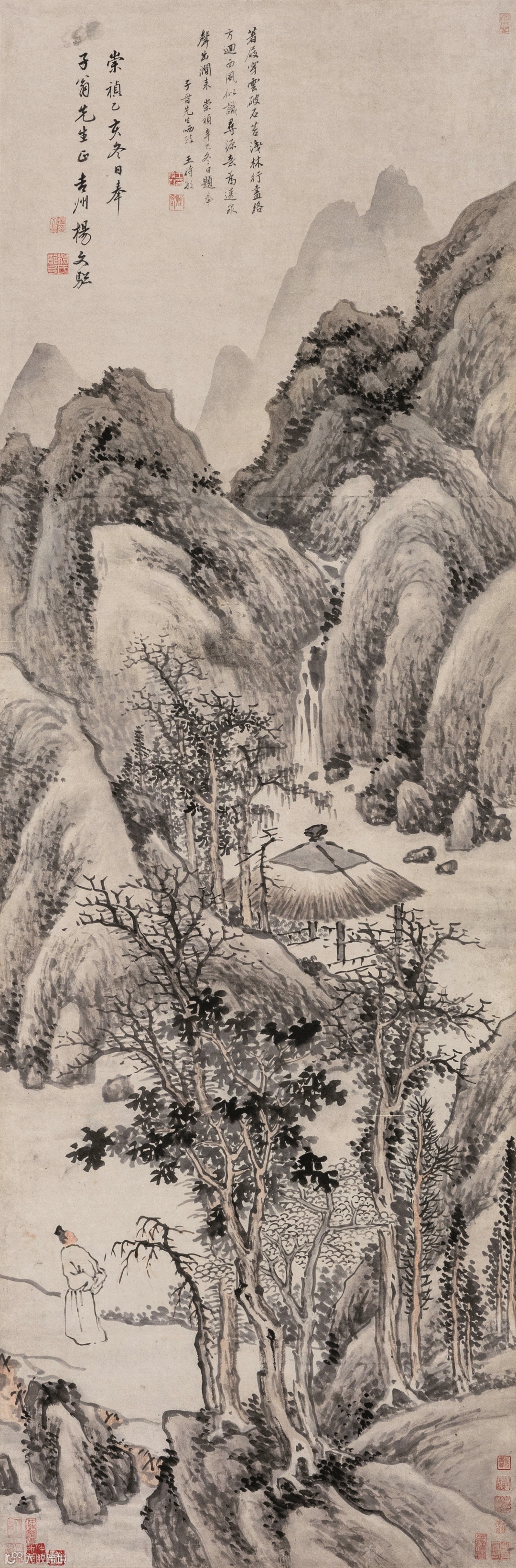 题跋:着屐穿云破石苔,浅林行尽路方回。西风似识寻源意,为送泉声出涧来。崇祯辛巳冬日题奉子晋先生哂政,王时敏。