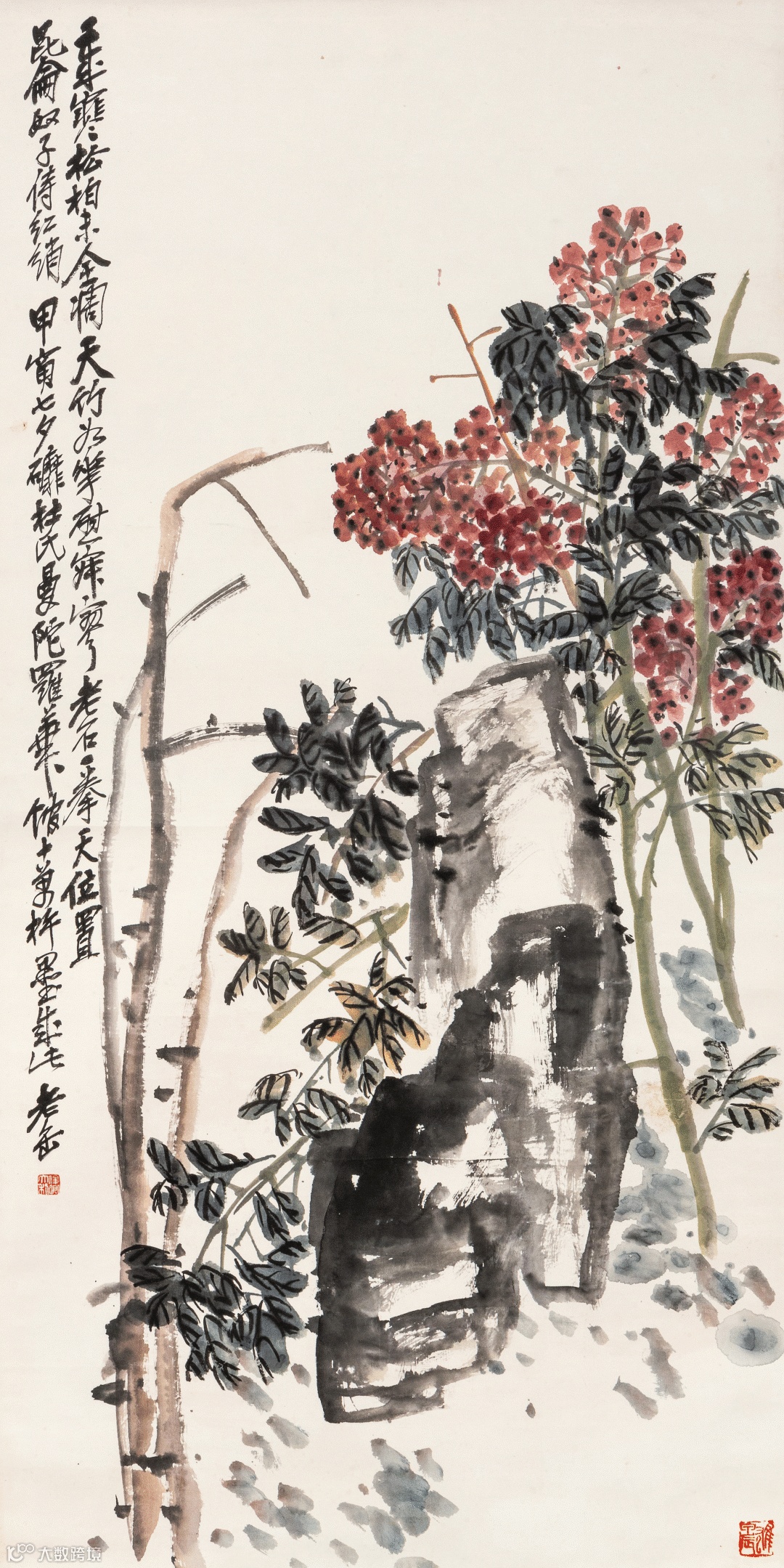 款识:岁寒松柏未全凋,天竹如花慰寂寥。老石一拳天位置,昆仑奴子侍红绡。甲寅七夕䃺杜氏曼陀罗华馆十万杵墨成此,老缶。