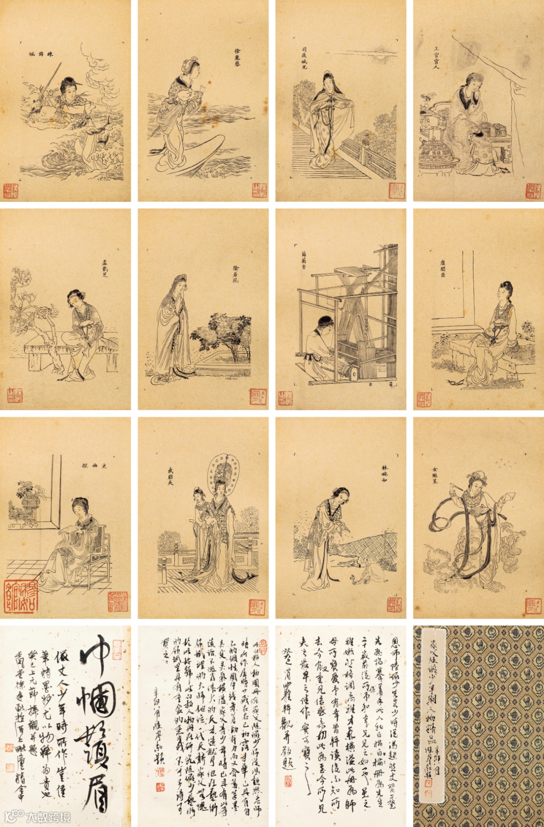 题跋:1.此白描人物图册,系家父陆俨少师从冯超然老师时所作,届时廿岁左右,已初露才华,已具有自己的个性。图中线条苍劲有力而又含蓄,笔墨灵变,灵气横溢。家父青少年时已具有此等造诣,不愧为伟大的天才,造就了他在艺术领域里的大师地位。一代天骄,家父无愧于此称号。此白描人物册在研究陆俨少艺术的领域里具有重要的意义,不可多得,可宝之。辛卯八月,陆亨敬题。